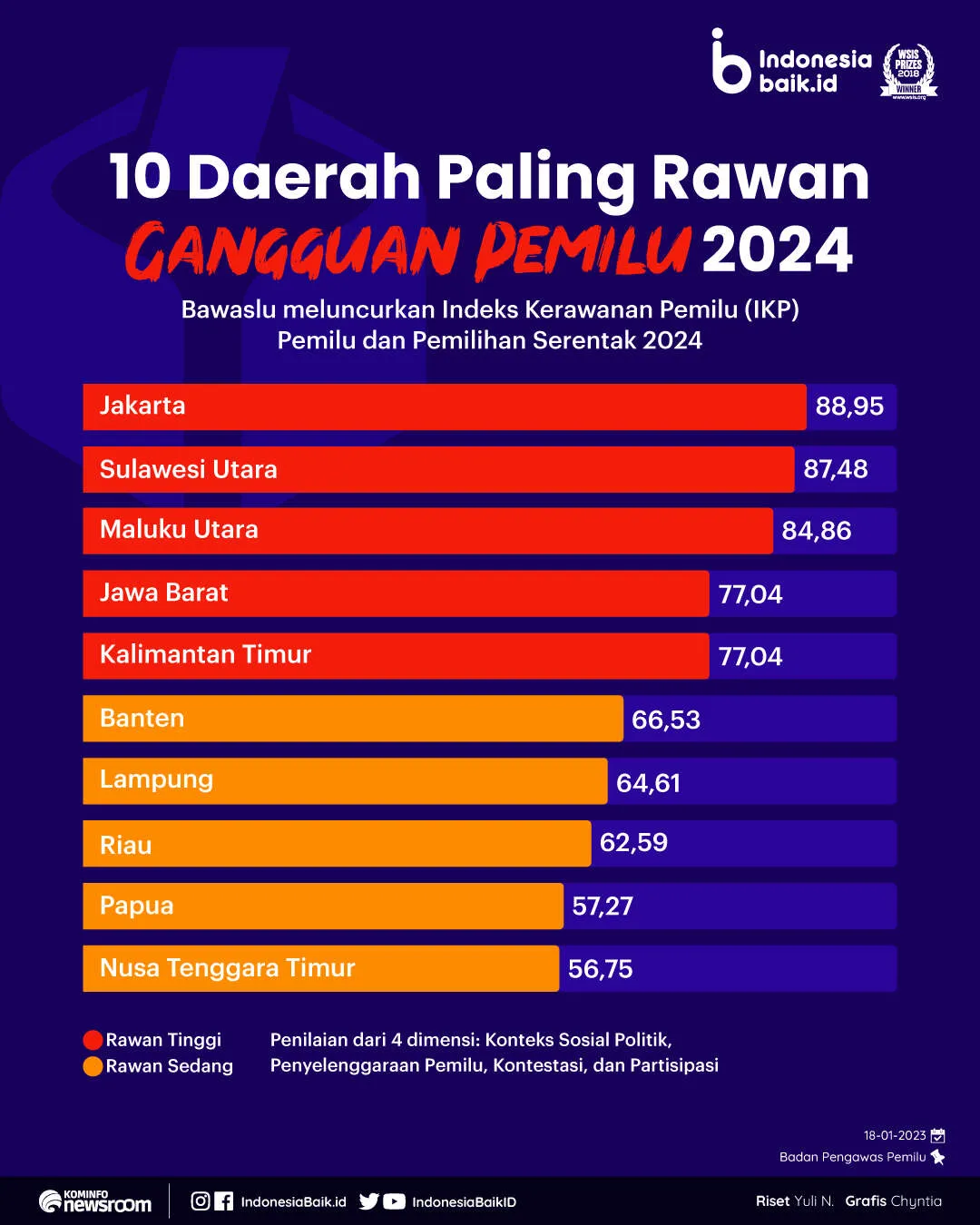 Indonesiabaik.id - Setiap menuju pesta demokrasi Indonesia, Badan Pengawas Pemilu (Bawaslu) meluncurkan Indeks Kerawanan Pemilu (IKP) dan Pemilihan Serentak 2024. Dalam IKP tersebut, Bawaslu melakukan pemetaan potensi Kerawanan di 34 provinsi dan 514 kabupaten dan kota seluruh Indonesia.