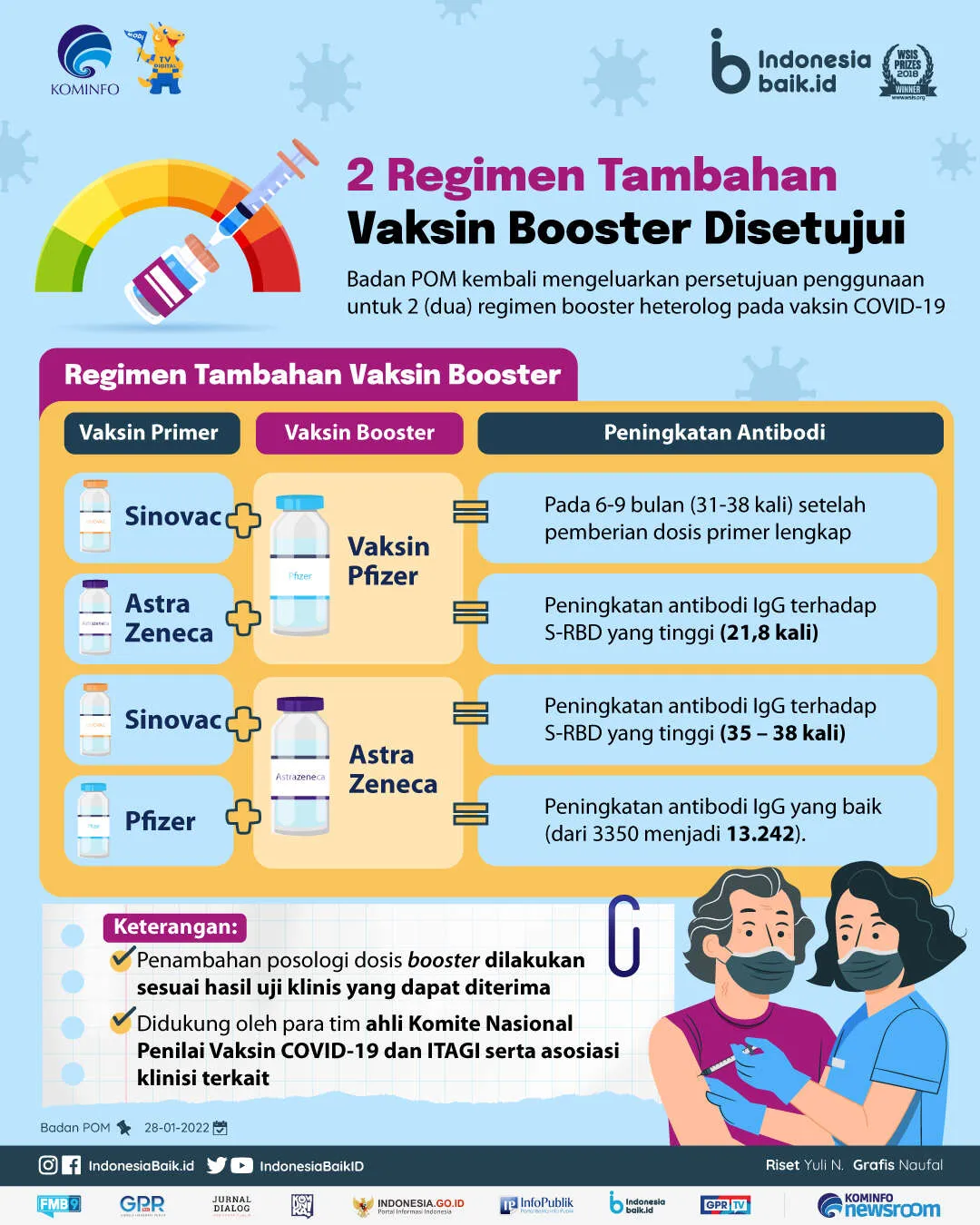 Indonesiabaik.id - Badan POM kembali mengeluarkan persetujuan penggunaan untuk 2 (dua) regimen booster heterolog pada vaksin COVID-19
