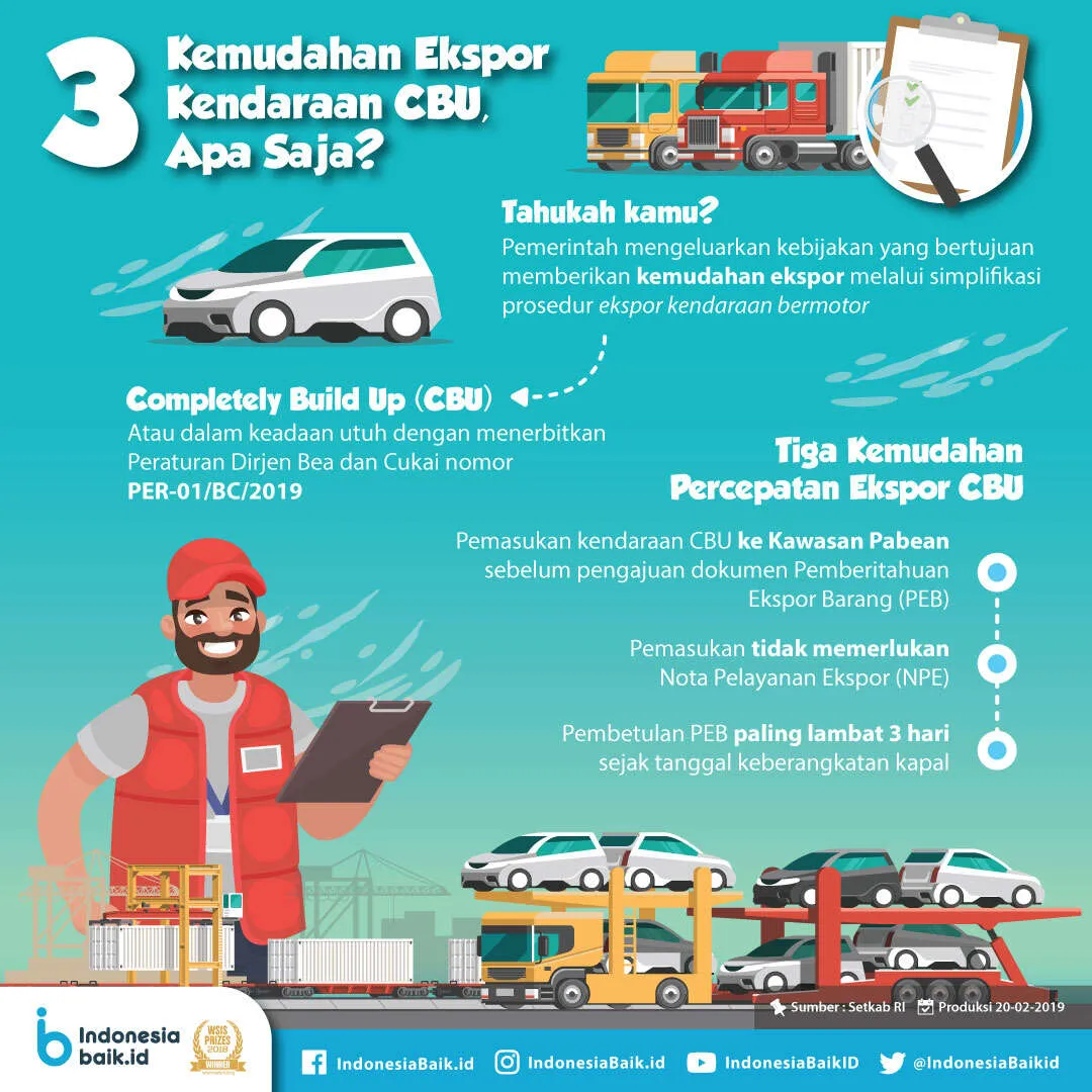 Indonesiabaik.id - Pemerintah mengeluarkan kebijakan yang bertujuan memberikan kemudahan ekspor. Kali ini melalui simplifikasi prosedur ekspor kendaraan bermotor dalam keadaan utuh/Completely Build Up (CBU) dengan menerbitkan Peraturan Dirjen Bea dan Cukai nomor PER-01/BC/2019 tentang Tata Laksana Ekspor Kendaraan Bermotor.