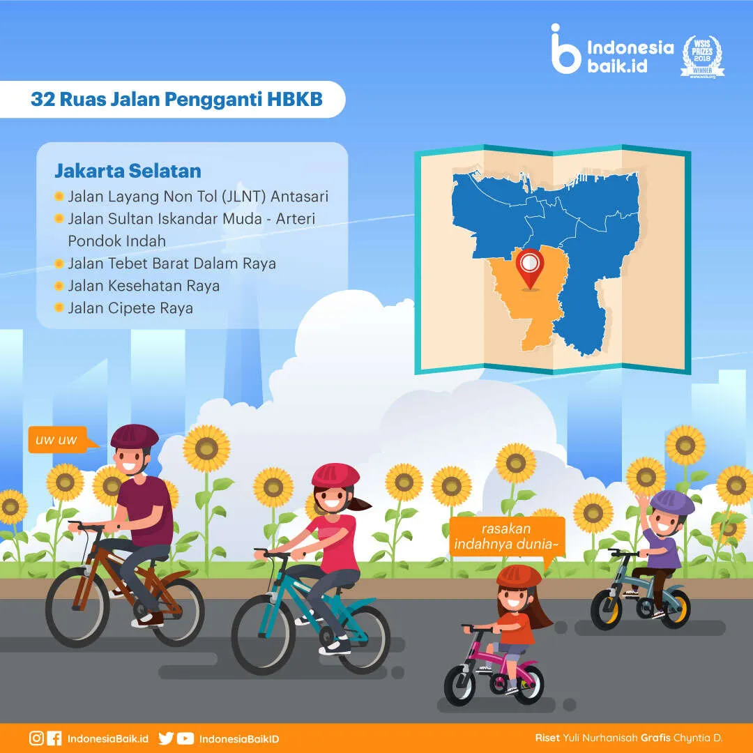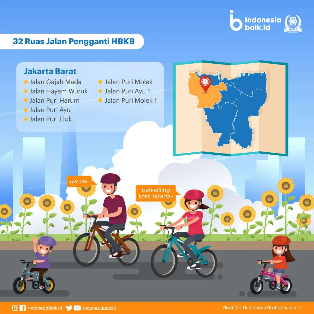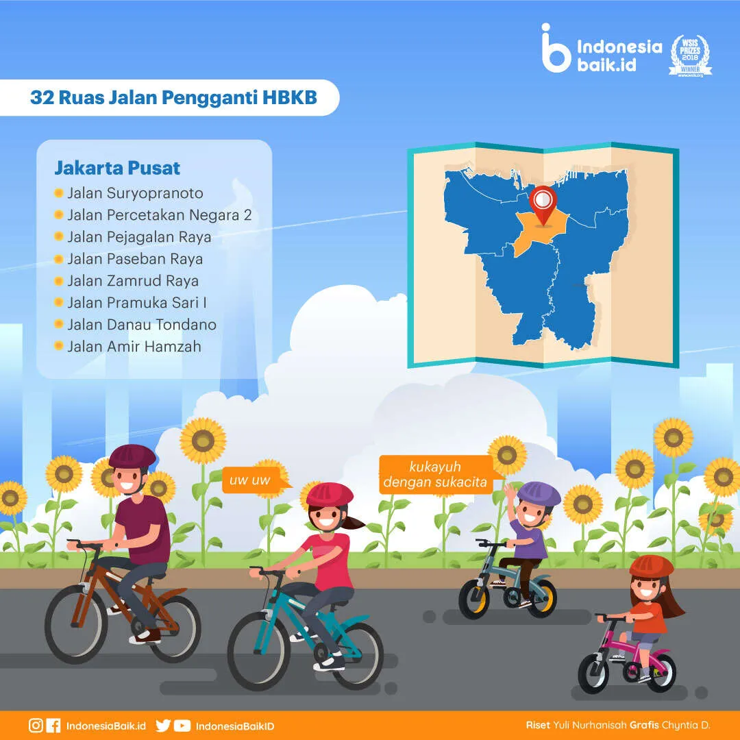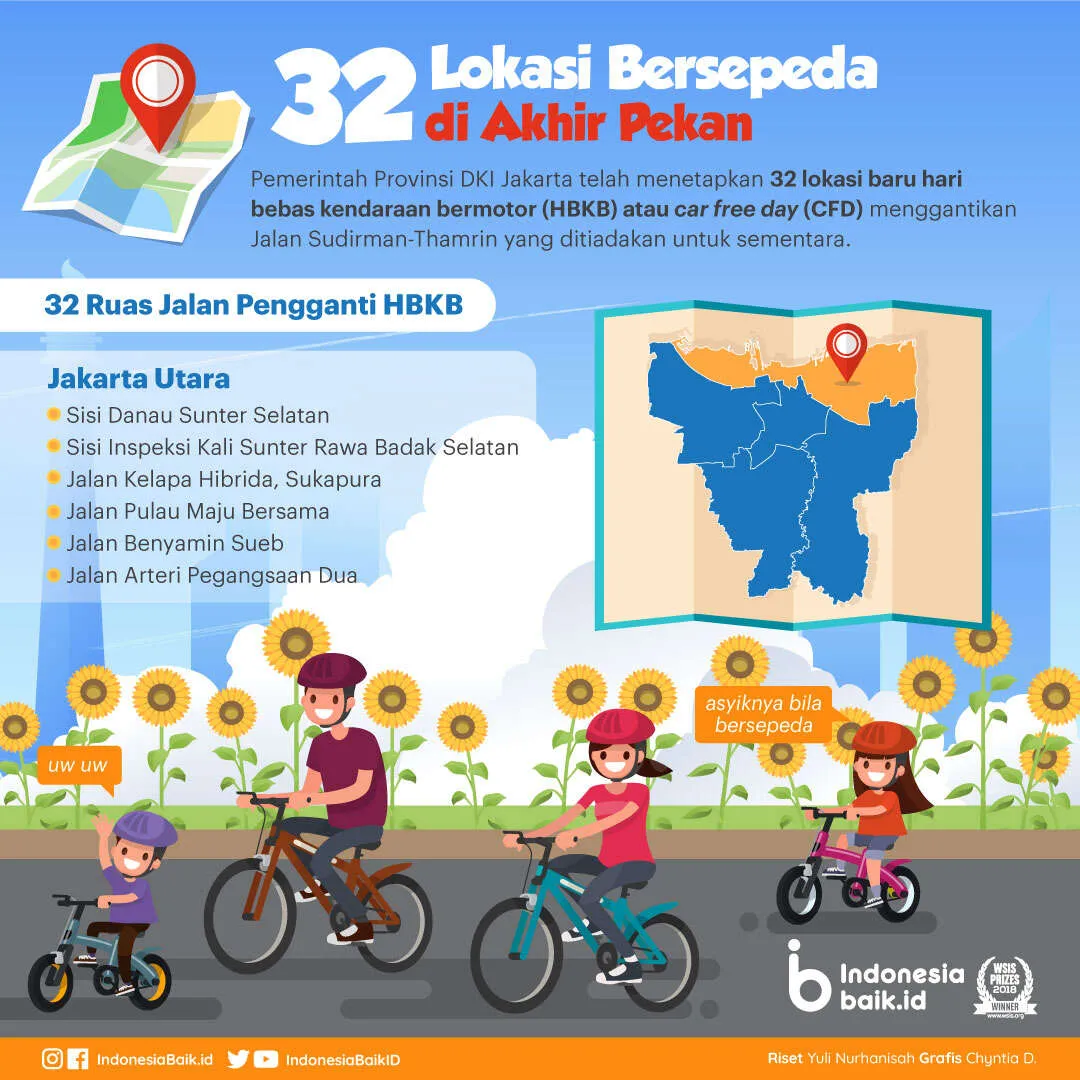 Indonesiabaik.id - Pemerintah Provinsi DKI Jakarta telah menetapkan 32 lokasi baru hari bebas kendaraan bermotor (HBKB) atau car free day (CFD). Lokasi-lokasi itu menggantikan Jalan Sudirman-Thamrin, yang CFD-nya ditiadakan untuk sementara