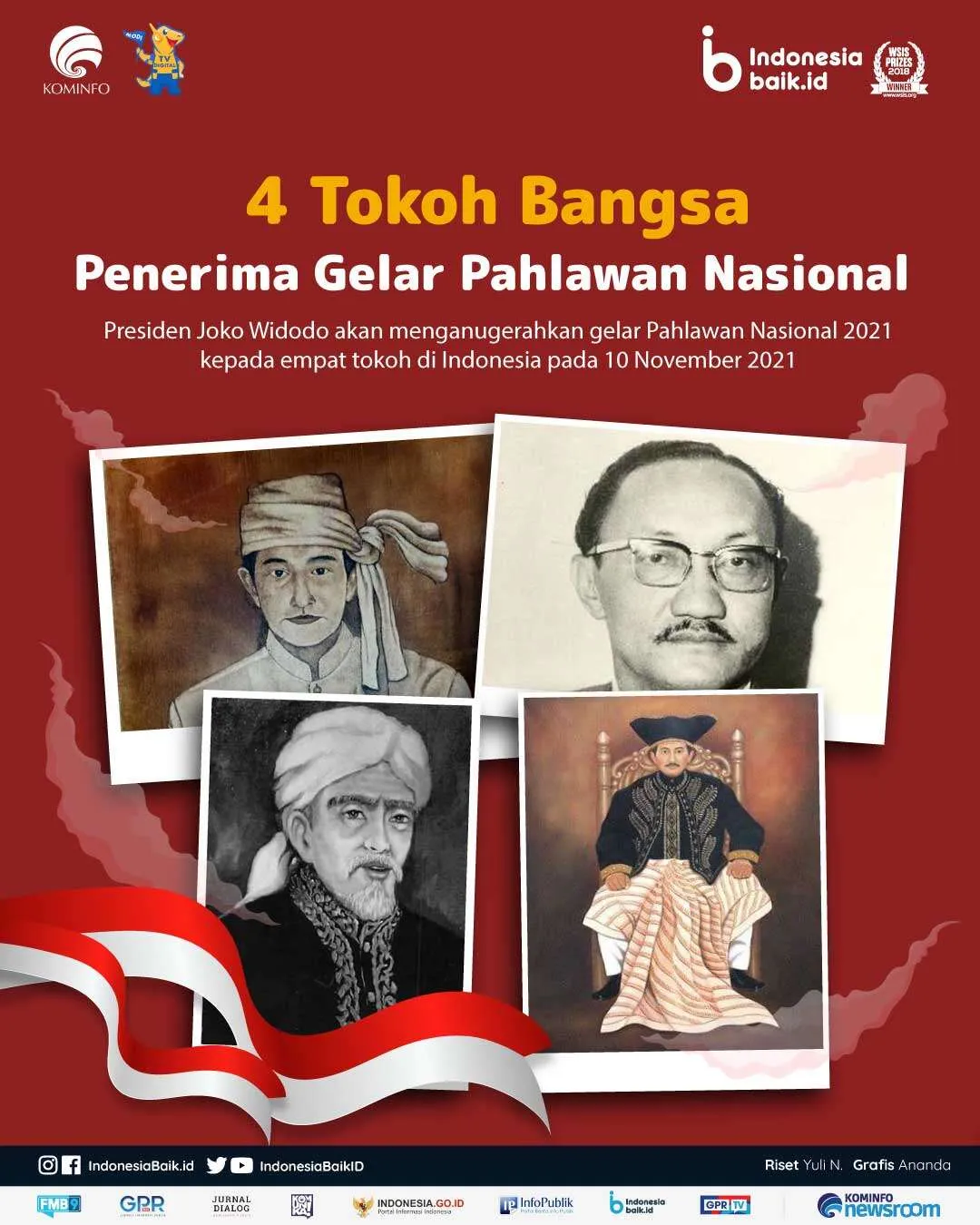 Indonesiabaik.id - Presiden Joko Widodo atau Jokowi akan menganugerahkan gelar Pahlawan Nasional 2021 kepada empat tokoh di Indonesia pada 10 November 2021 di Istana Bogor, Jawa Barat. Pemberian gelar itu telah ditetapkan melalui Keputusan Presiden nomor 109/TK/2021 tentang Penganugerahan Pahlawan Nasional.