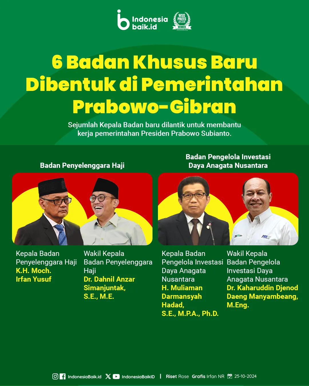 Indonesiabaik.id — Sejumlah Kepala Badan baru dilantik untuk membantu kerja pemerintahan Presiden Prabowo Subianto.