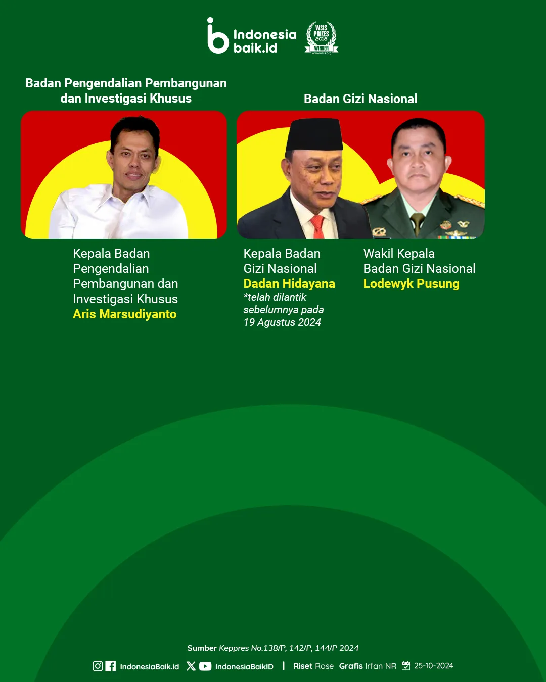 - Kepala Badan Gizi Nasional: Dadan Hidayana (telah dilantik sebelumnya pada 19 Agustus 2024)