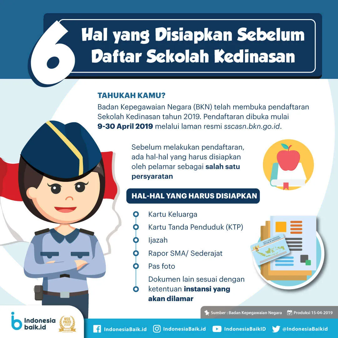 Indonesiabaik.id - Badan Kepegawaian Negara (BKN) telah membuka pendaftaran Sekolah Kedinasan tahun 2019. Pendaftaran dibuka mulai 9-30 April 2019 melalui laman resmi sscasn.bkn.go.id. Sebelum melakukan pendaftaran, ada hal-hal yang harus disiapkan oleh pelamar sebagai salah satu persyaratan. Apa saja persyaratannya?