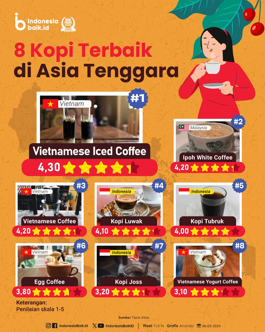 Sementara, peringkat pertama kopi terbaik di Asia Tenggara versi Taste Atlas ditempati oleh vietnamese iced coffee atau es kopi Vietnam yang meraih skor 4,3 poin.