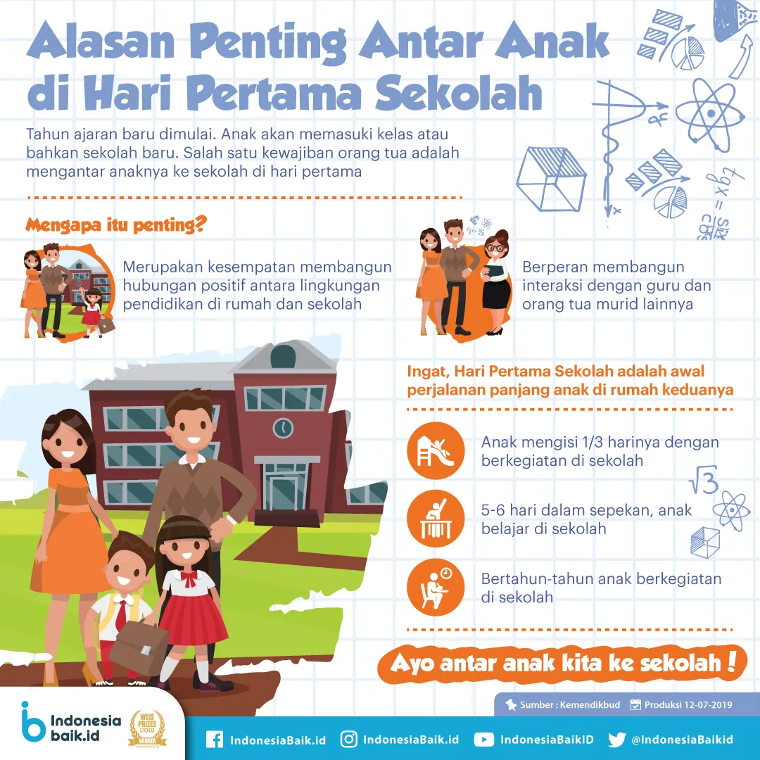 Indonesiabaik.id - Libur telah usai, tahun ajaran baru sebentar lagi dimulai. Biasanya rutinitas orangtua saat menyambut datangnya tahun ajaran baru adalah mempersiapkan perlengkapan sekolah anak. Namun, satu hal penting yang sering dilupakan adalah menyisihkan waktu untuk mengantar anak ke sekolah di hari pertama tahun ajaran baru.