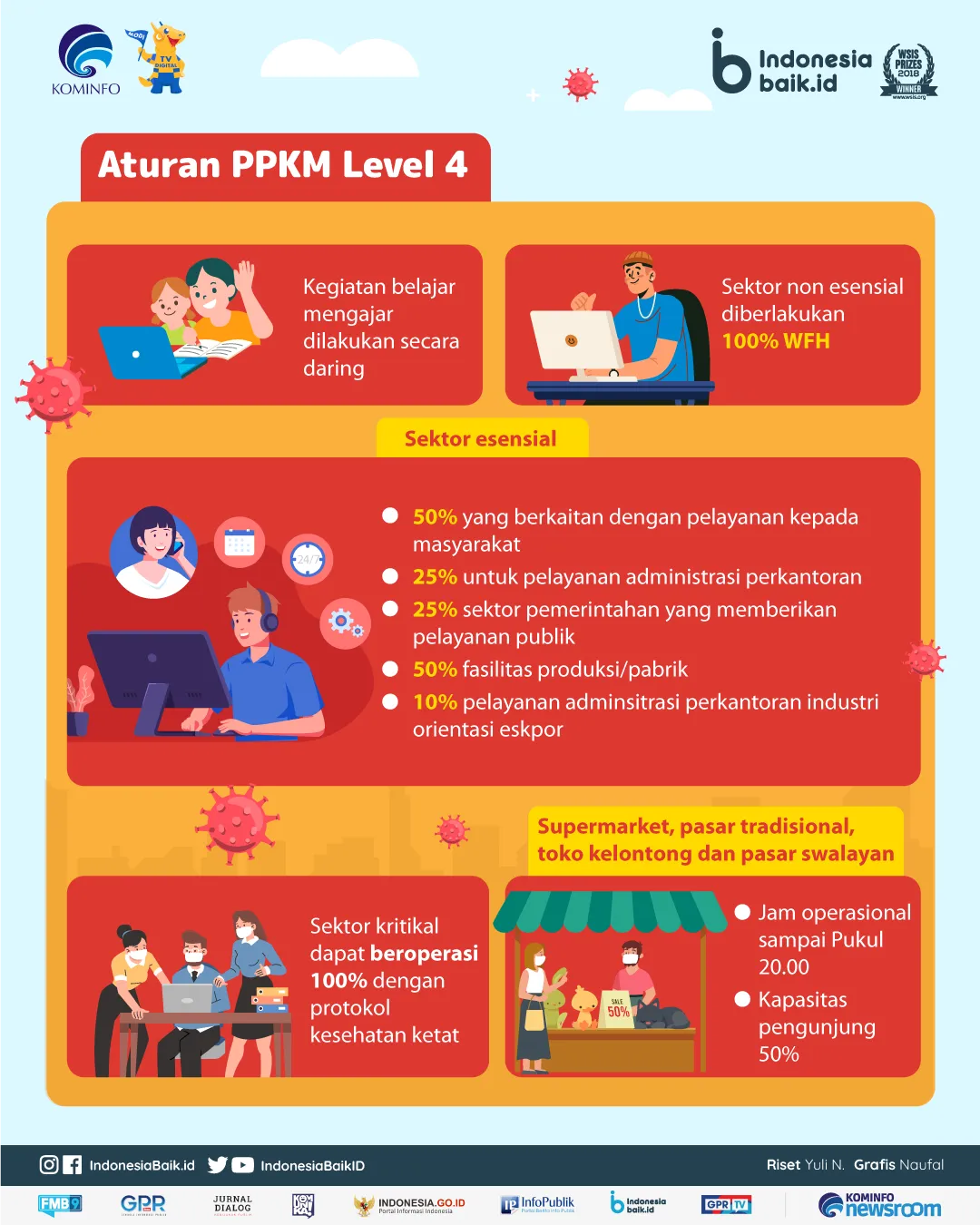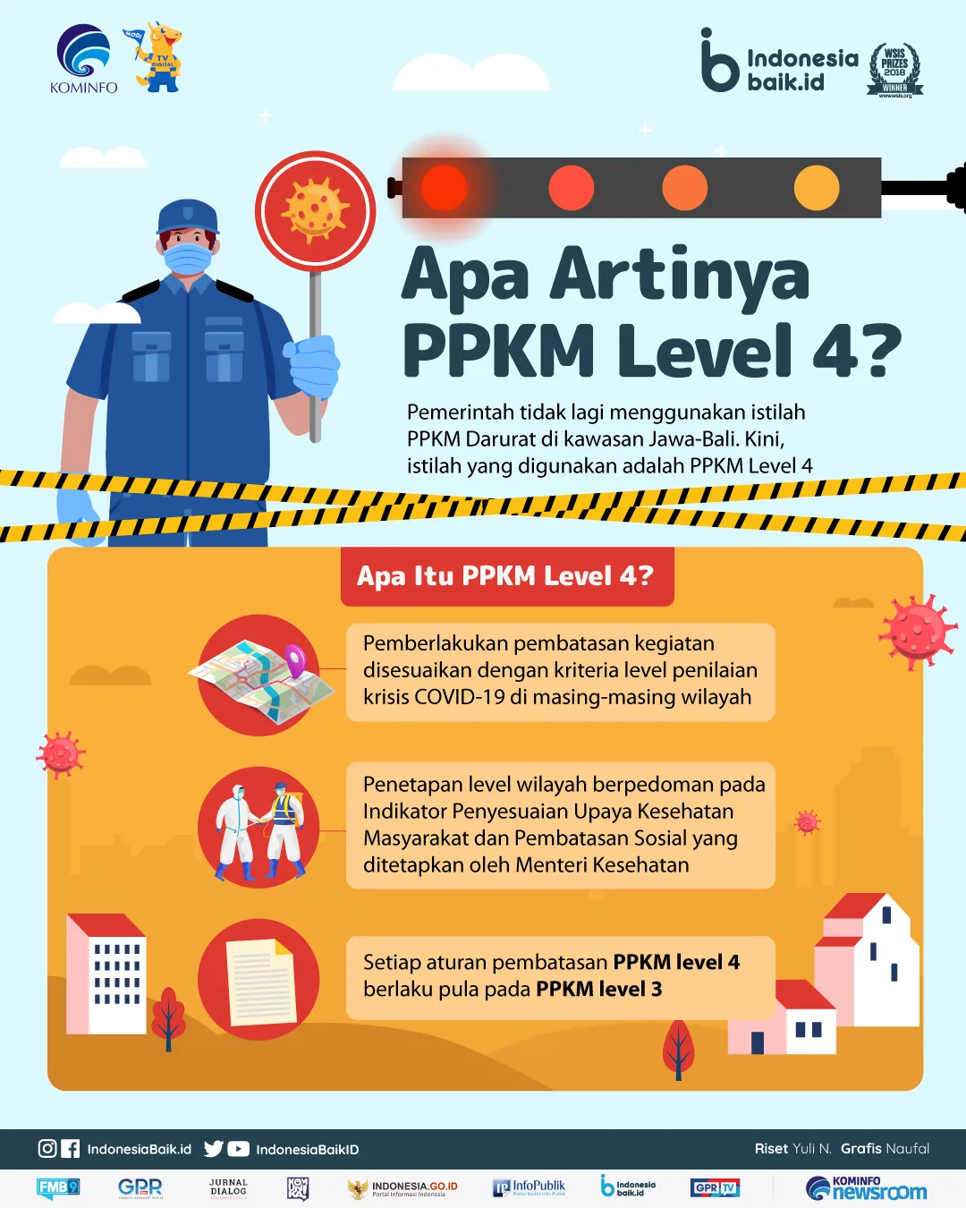 Di dalam instruksi Mendagri tersebut dijelaskan, PPKM Level 4 adalah pemberlakukan pembatasan kegiatan di Jawa dan Bali dan disesuaikan dengan kriteria level situasi pandemi berdasarkan hasil assesment atau penilaian.