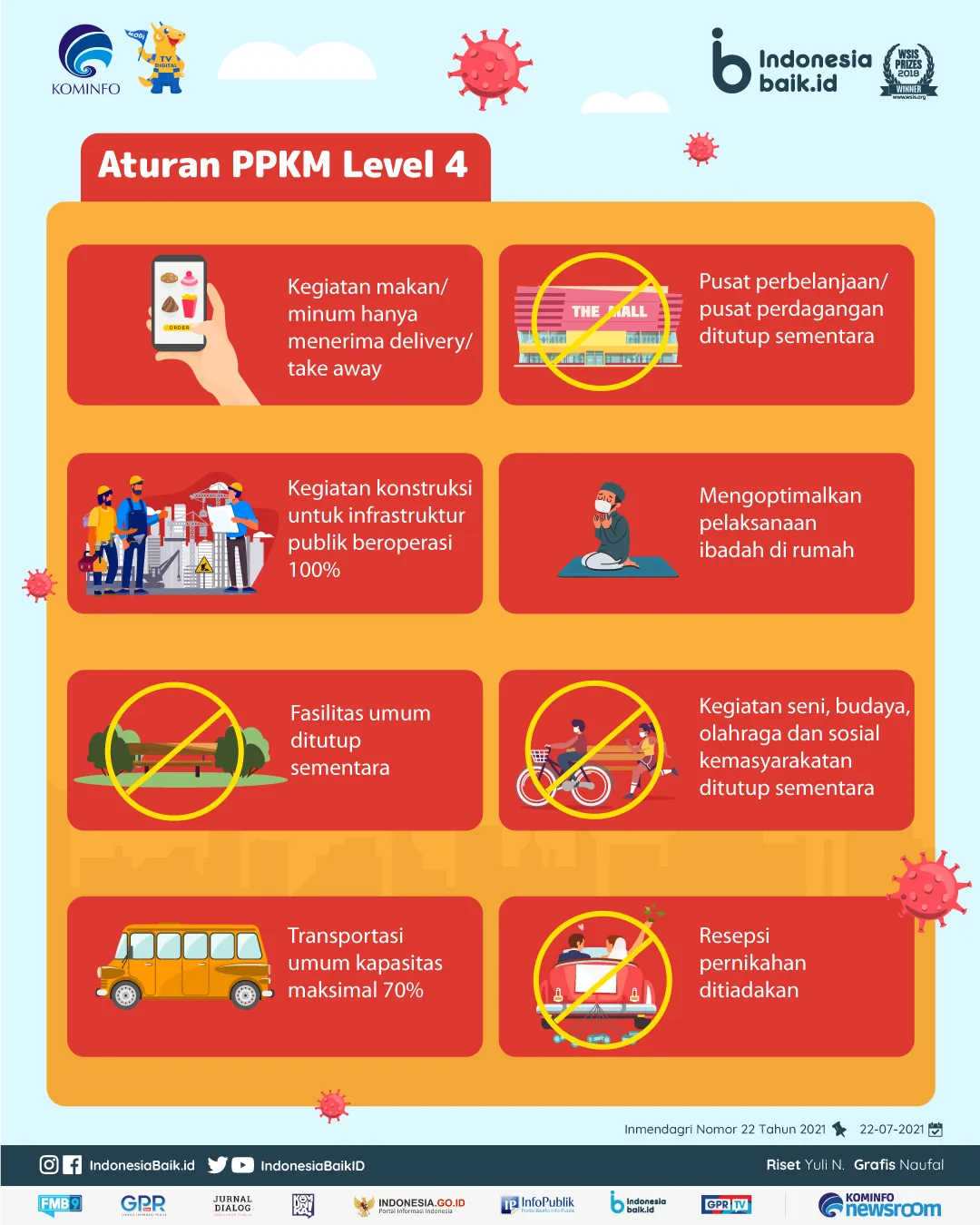 Indonesiabaik.id - Pemerintah tidak lagi menggunakan istilah Pemberlakuan Pembatasan Kegiatan Masyarakat Darurat (PPKM Darurat) di kawasan Jawa-Bali. Kini, istilah tersebut menjadi PPKM Level 4. Hal tersebut tertuang di dalam Instruksi Menteri Dalam Negeri Nomor 22 Tahun 2021 tentang PPKM Level 4 Covid-19 di Wilayah Jawa Bali.
