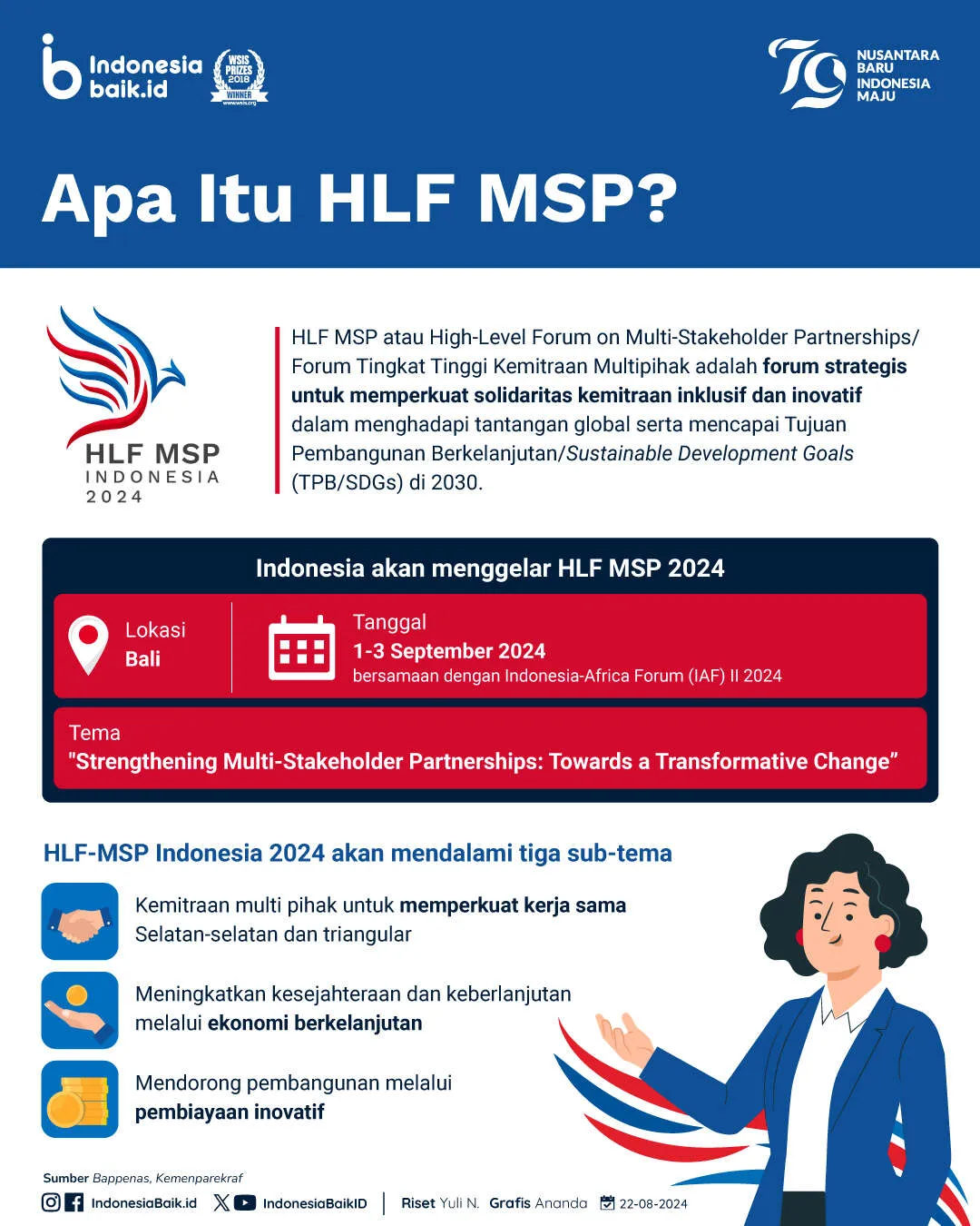 Indonesiabaik.id - Indonesia segera menggelar Forum Tingkat Tinggi Kemitraan Multipihak atau High-Level Forum on Multi-Stakeholder Partnerships (HLF MSP) 2024 pada 1-3 September 2024 di Bali. Forum ini merupakan platform strategis untuk memperkuat solidaritas kemitraan inklusif dan inovatif dalam menghadapi tantangan global serta mencapai Tujuan Pembangunan Berkelanjutan/ Sustainable Development Goals (TPB/SDGs) di 2030.