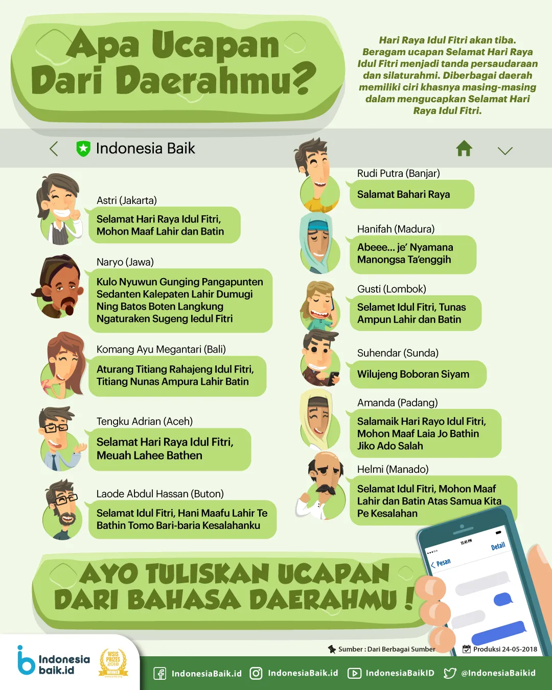 Indonesiabaik.id - Memasuki bulan Ramadan berarti Hari Raya Idul Fitri akan tiba. Beragam ucapan Selamat Hari Raya Idul Fitri menjadi tanda persaudaraan dan silaturahmi. Diberbagai daerah memiliki ciri khasnya masing-masing dalam mengucapkan Selamat Hari Raya Idul Fitri. Ucapan-ucapan tersebut mayoritas memiliki arti yang sama yaitu Selamat Hari Raya Idul Fitri, Mohon Maaf Lahir dan Batin.