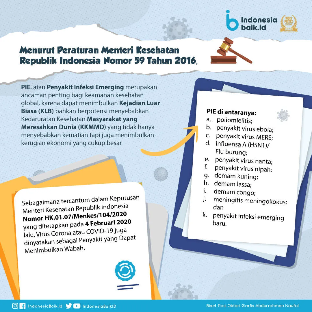 Virus Corona yang belakangan disebut dengan COVID-19, juga juga telah ditetapkan sebagai penyakit yang dapat menimbulkan wabah sebagaimana tercantum dalam Keputusan Menteri Kesehatan Republik Indonesia Nomor HK.01.07/Menkes/104/2020 yang ditetapkan pada 4 Februari 2020 lalu.