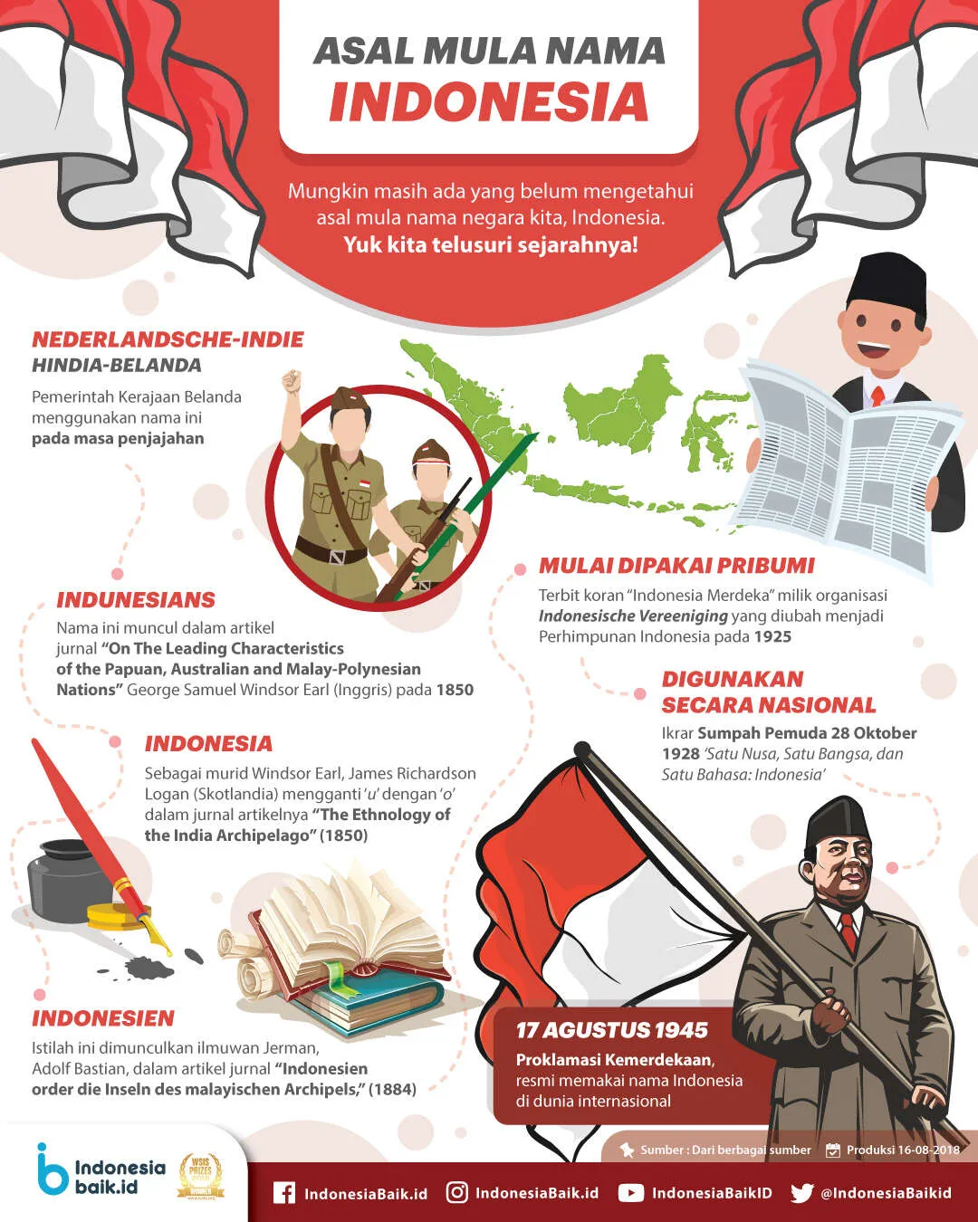 Nama Indonesia lalu dipopulerkan oleh etnolog Jerman, Adolf Bastian melalui bukunya, Indonesien Oder Die Inseln Des Malayischen Archipels dan Die Volkev des Ostl Asien (1884). Pada 1924, pemakaian nama Indonesia dimulai dengan terbitnya koran Indonesia Merdeka milik Perhimpunan Indonesia. Kemudian penggunaan secara nasional bersama-sama terucap dalam ikrar Sumpah Pemuda 28 Oktober 1928 hingga akhirnya Negara kita resmi bernama Indonesia melalui Proklamasi Kemerdekaan 17 Agustus 1945.