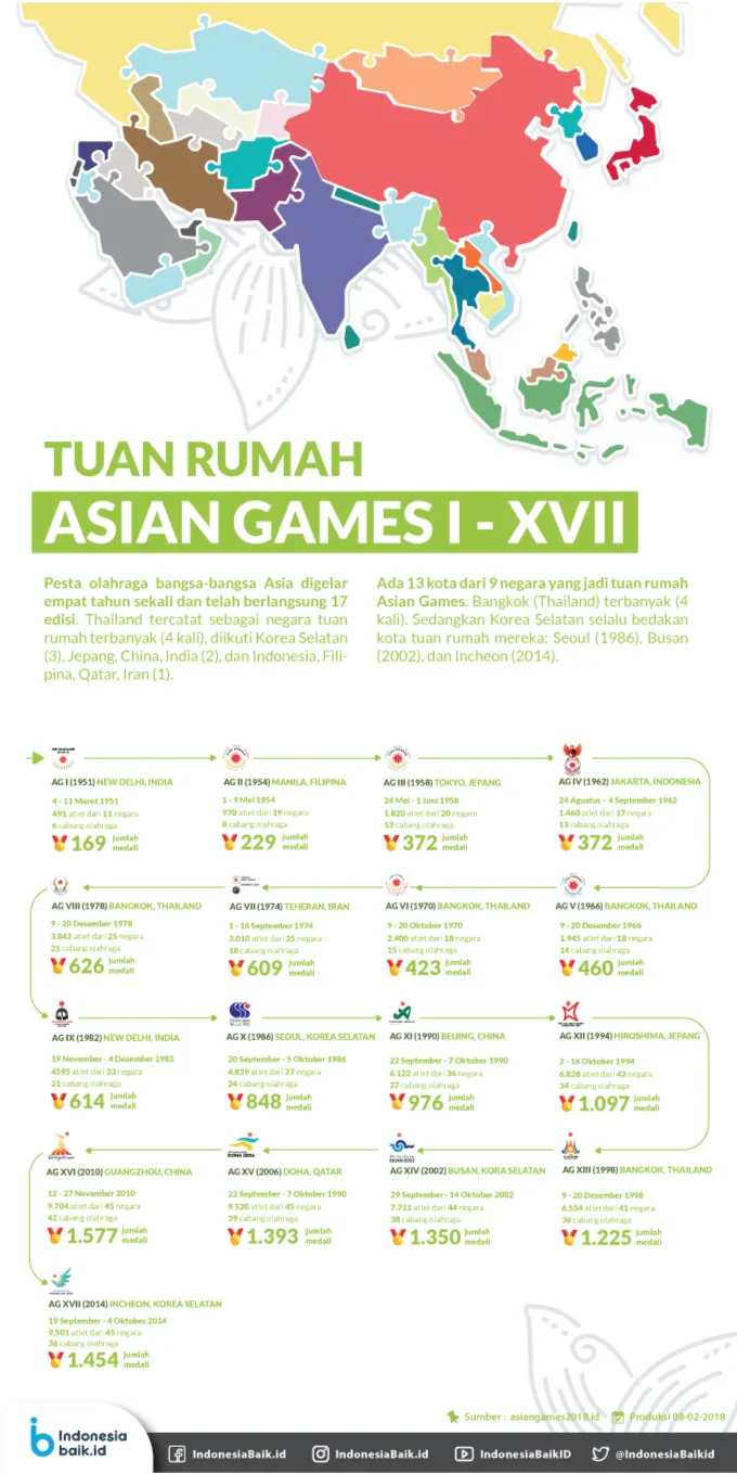 Nah bila Anda penasaran, jawabannya akan kami sajikan dalam infografis berikut yang akan memaparkan profil tuan rumah Asian Games edisi pertama hingga ke-17. Kami sajikan juga waktu penyelenggaraan, perkembangan jumlah peserta, jumlah cabang olahraga yang dipertandingkan, hingga jumlah medali yang diperebutkan di setiap gelaran Asian Games.