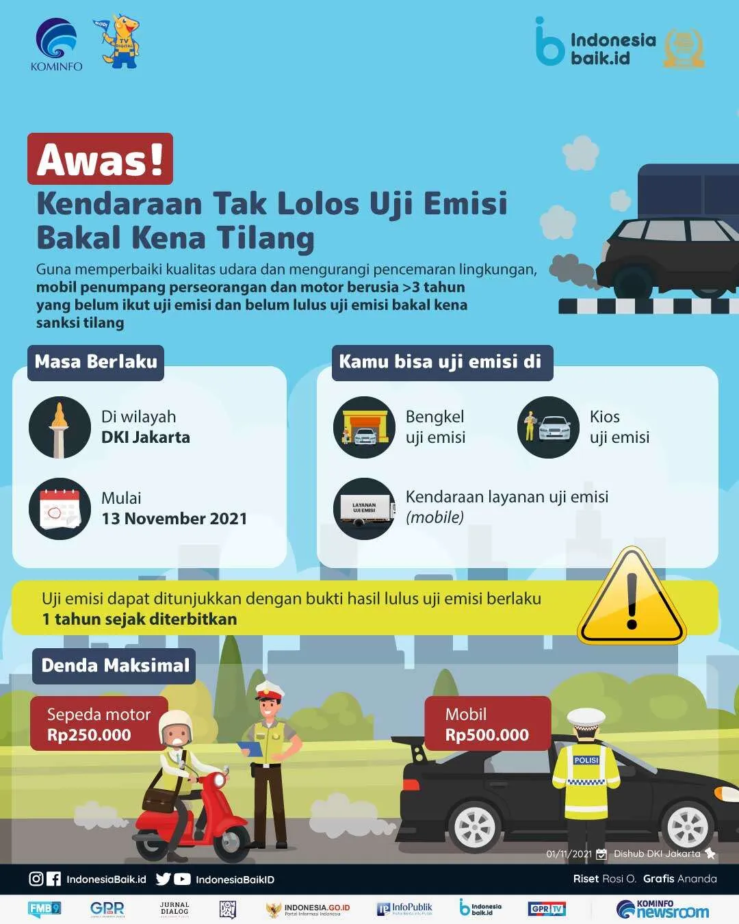 indonesiabaik.id - DKI Jakarta secara resmi menerapkan sanksi tilang bagi pemilik kendaraan yang tidak lulus uji emisi gas buang mulai 13 November 2021.