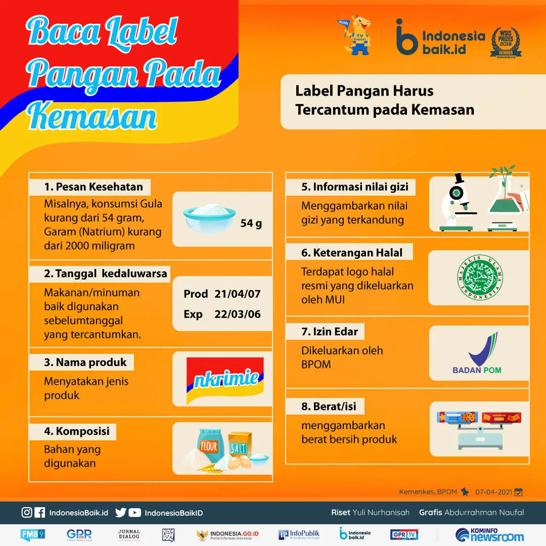 Indonesiabaik.id - Perlu diketahui, label pada kemasan makanan atau minuman mempunyai istilah sebagai label pangan. Label ini merupakan keterangan mengenai pangan dan informasi gizi yang berbentuk gambar, tulisan, kombinasi keduanya, atau bentuk lain yang disertakan pada pangan.