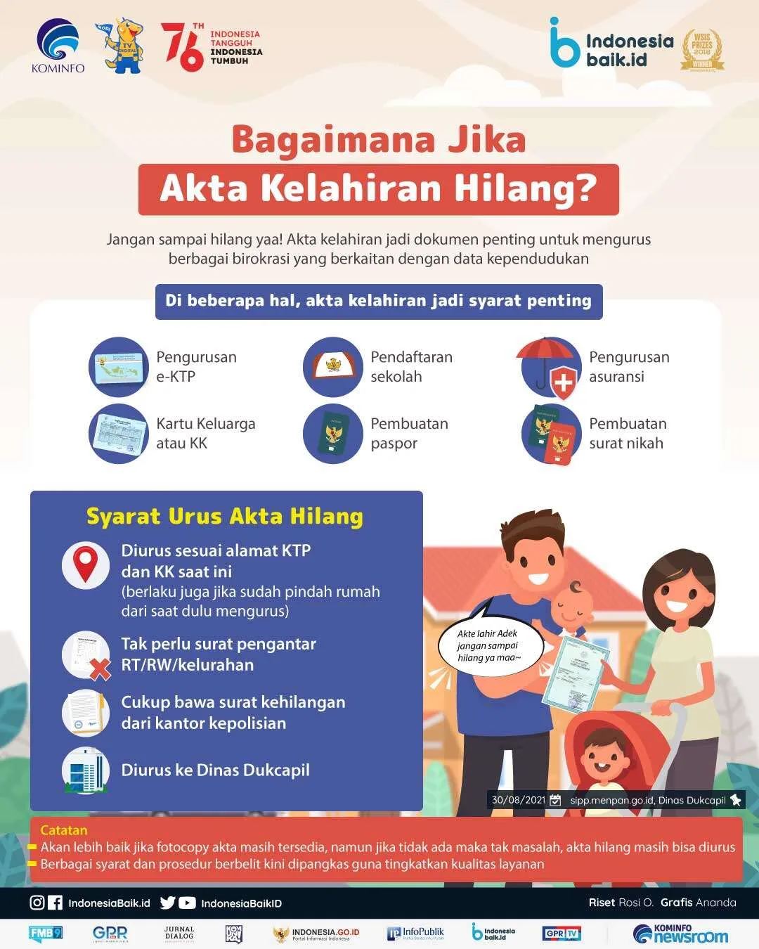 Disampaikan oleh Direktur Jenderal Kependudukan dan Pencatatan Sipil Kemendagri Zudan Arif Fakrulloh, mengurus akta kelahiran yang hilang ternyata mudah dan tak dipungut biaya. Adapun akta yang hilang dapat dicetak kembali.