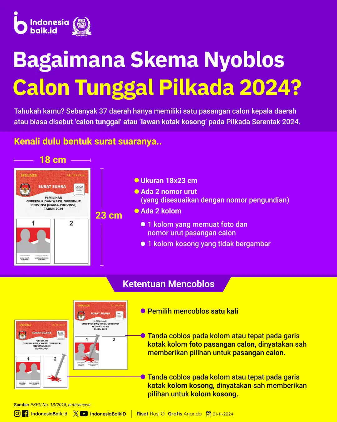 Terkait desain surat suara untuk pemilihan dengan hanya 1 pasangan calon alias ‘lawan kotak kosong’ diatur lengkap dalam aturan PKPU No.13/2018.