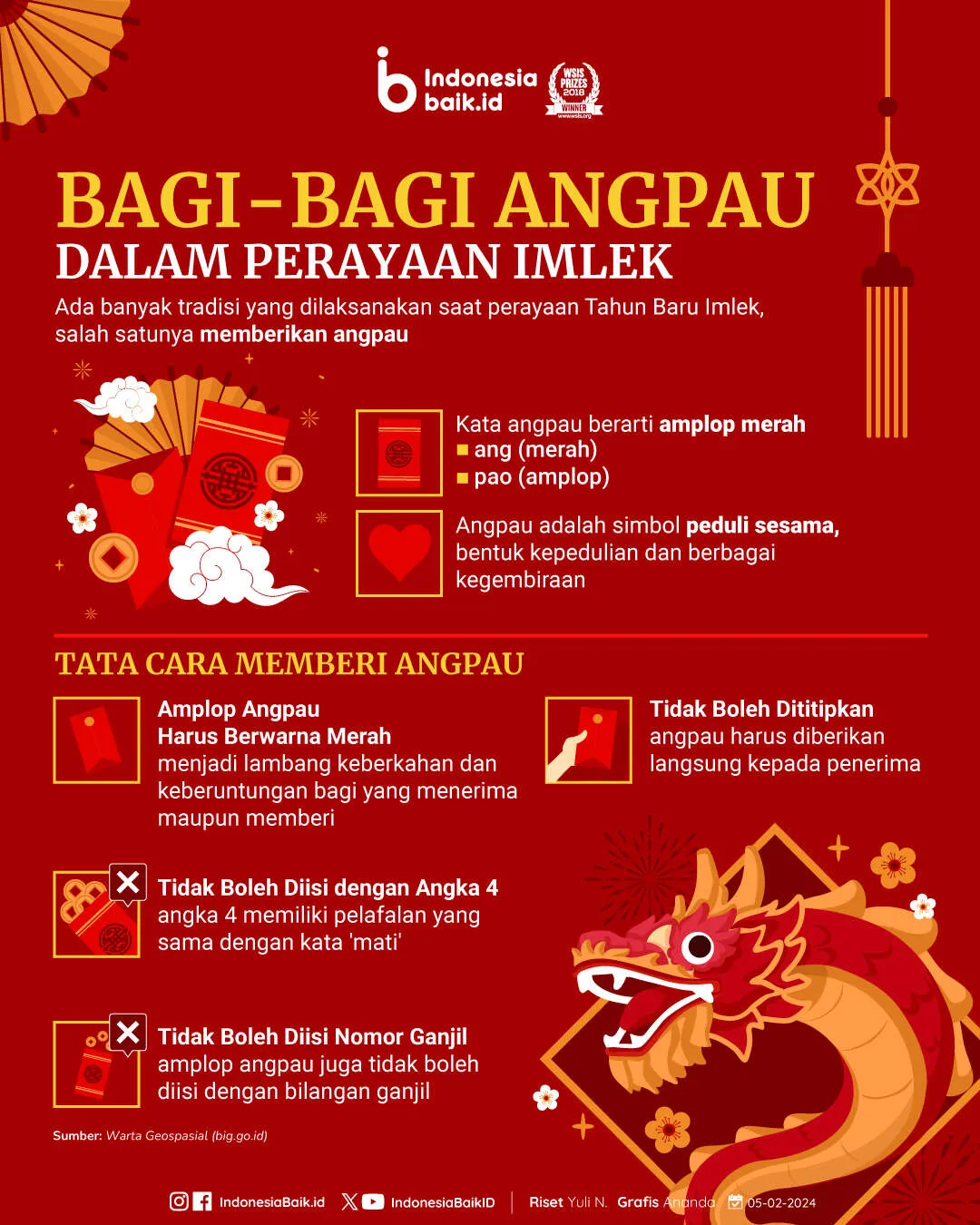 Indonesiabaik.id - Ada banyak tradisi yang dilaksanakan saat perayaan Tahun Baru Imlek, namun ada salah satu tradisi yang tidak boleh dilewatkan seperti memberikan angpau Imlek.