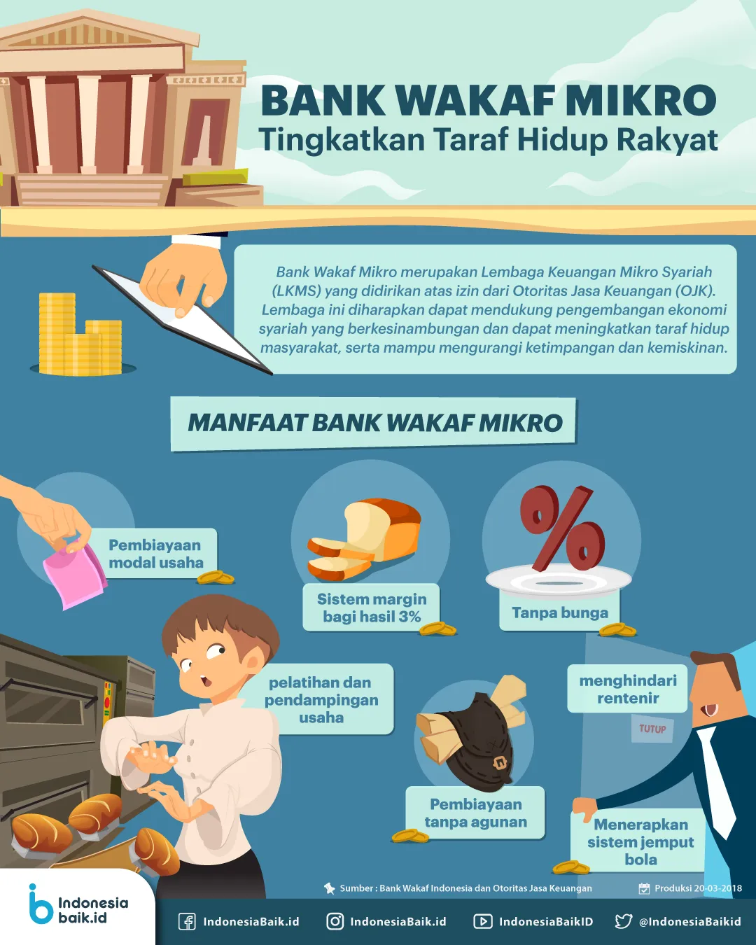 Indonesiabaik.id - Bank Wakaf Mikro merupakan Lembaga Keuangan Mikro Syariah (LKMS) yang fokus pada pembiayaan masyarakat kecil. Dalam membentuk LKMS, OJK bekerjasama dengan Lembaga Amil Zakat Nasional (Laznas). LKMS Bank Wakaf Mikro merupakan salah satu upaya untuk mengatasi ketimpangan dan kemiskinan di masyarakat. Selain itu, pendirian LKMS di lingkungan pesantren ini juga diharapkan dapat meningkatkan literasi keuangan syariah.