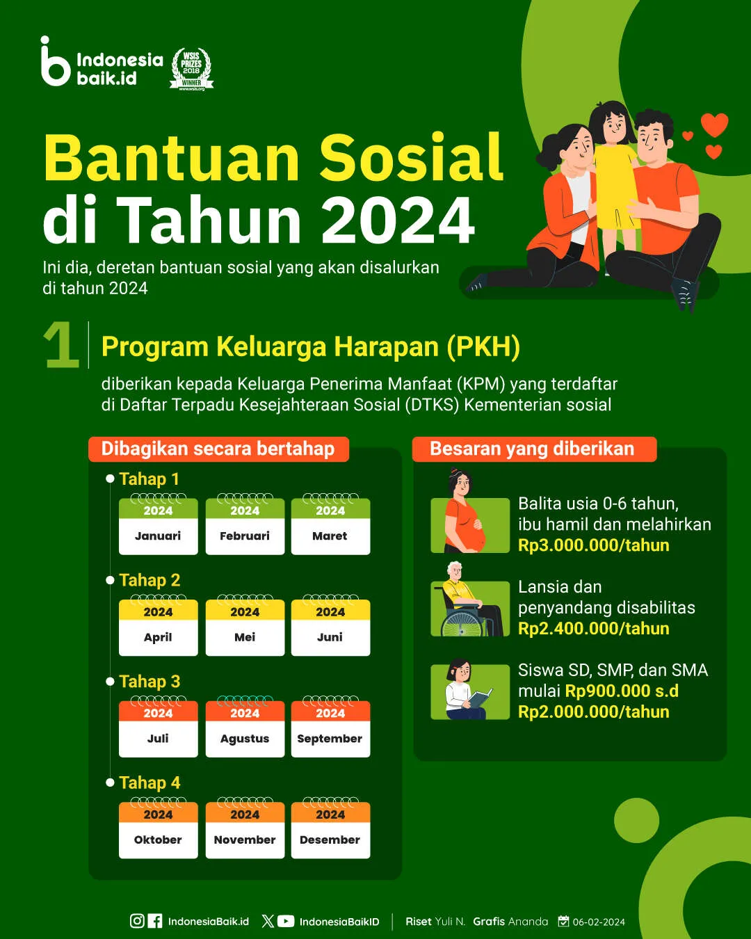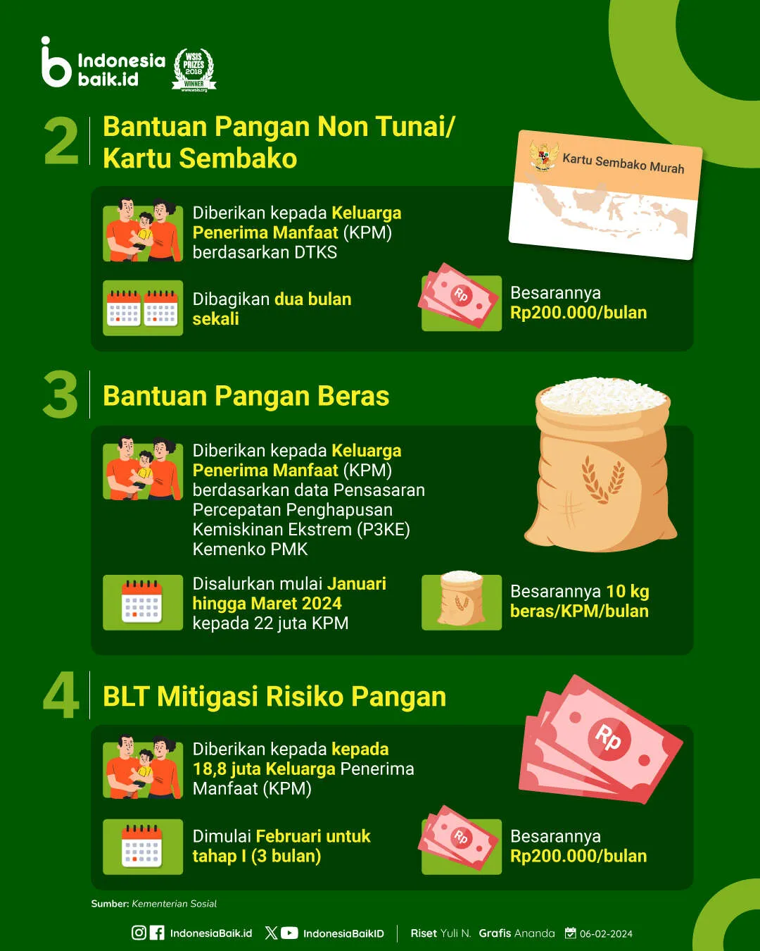 Sesuai dengan janji pemerintah, beberapa bansos akan cair di tahun 2024 untuk keluarga penerima manfaat (KPM), yakni bansos Program Keluarga Harapan (PKH), bantuan pangan nontunai (BPNT), bansos beras 10 kg setiap bulan dan BLT mitigasi risiko pangan.