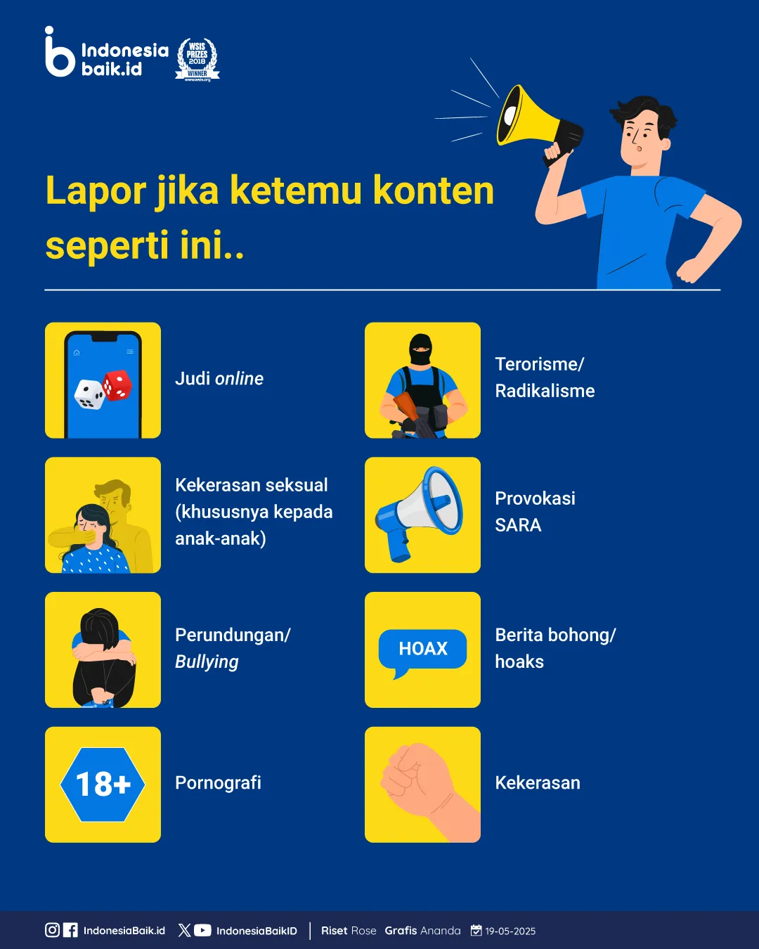 Mulai dari penyebaran hoaks, perundungan, pornografi, terorisme, provokasi, judi online, hingga kekerasan seksual, dunia digital bisa menjadi ruang berbahaya jika kita semua tidak waspada.