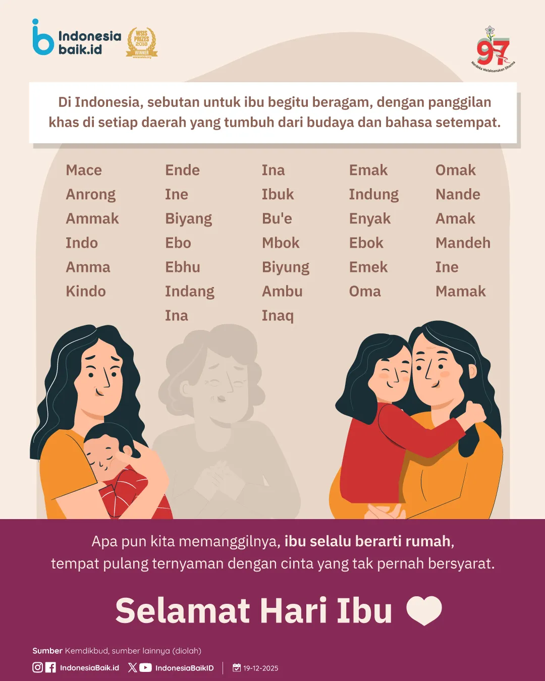 Meski namanya beragam, maknanya tetap satu. Ibu selalu hadir sebagai sosok yang mengasuh, menguatkan, dan menemani sejak langkah pertama kehidupan. Di balik setiap panggilan, tersimpan cerita tentang pengorbanan, ketulusan, dan cinta yang tumbuh tanpa syarat, melintasi waktu dan keadaan.