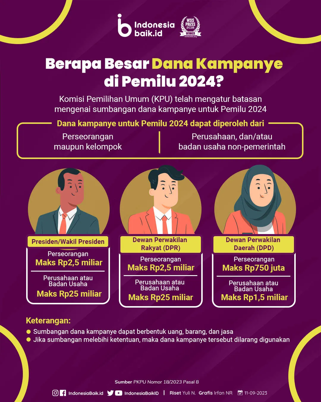 Indonesiabaik.id - Komisi Pemilihan Umum (KPU) telah mengatur batasan mengenai sumbangan dana kampanye untuk Pemilu 2024. Hal itu sebagaimana diatur dalam Peraturan KPU (PKPU) Nomor 18 Tahun 2023 yang terbit pada 1 September 2023.