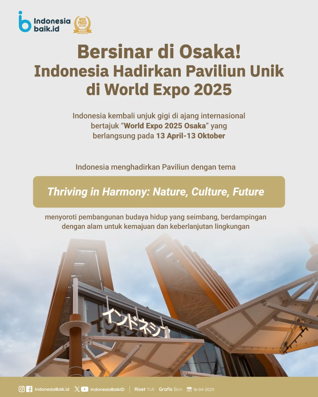 Indonesiabaik.id - Indonesia akan kembali tampil memukau di kancah internasional dalam ajang World Expo 2025 Osaka yang akan digelar pada 13 April hingga 13 Oktober 2025 di Osaka, Jepang.