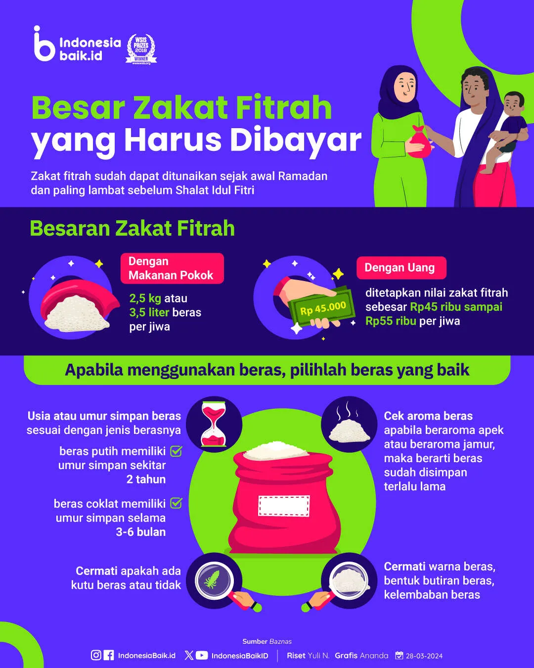 Indonesiabaik.id - Memasuki bulan suci Ramadhan, ada dua kewajiban umat Islam yang tidak bisa dilakukan di bulan-bulan lainnya, yaitu puasa dan zakat fitrah. Zakat fitrah sudah dapat mulai ditunaikan sejak awal Ramadan dan paling lambat dilakukan sebelum pelaksanaan Shalat Idul Fitri.