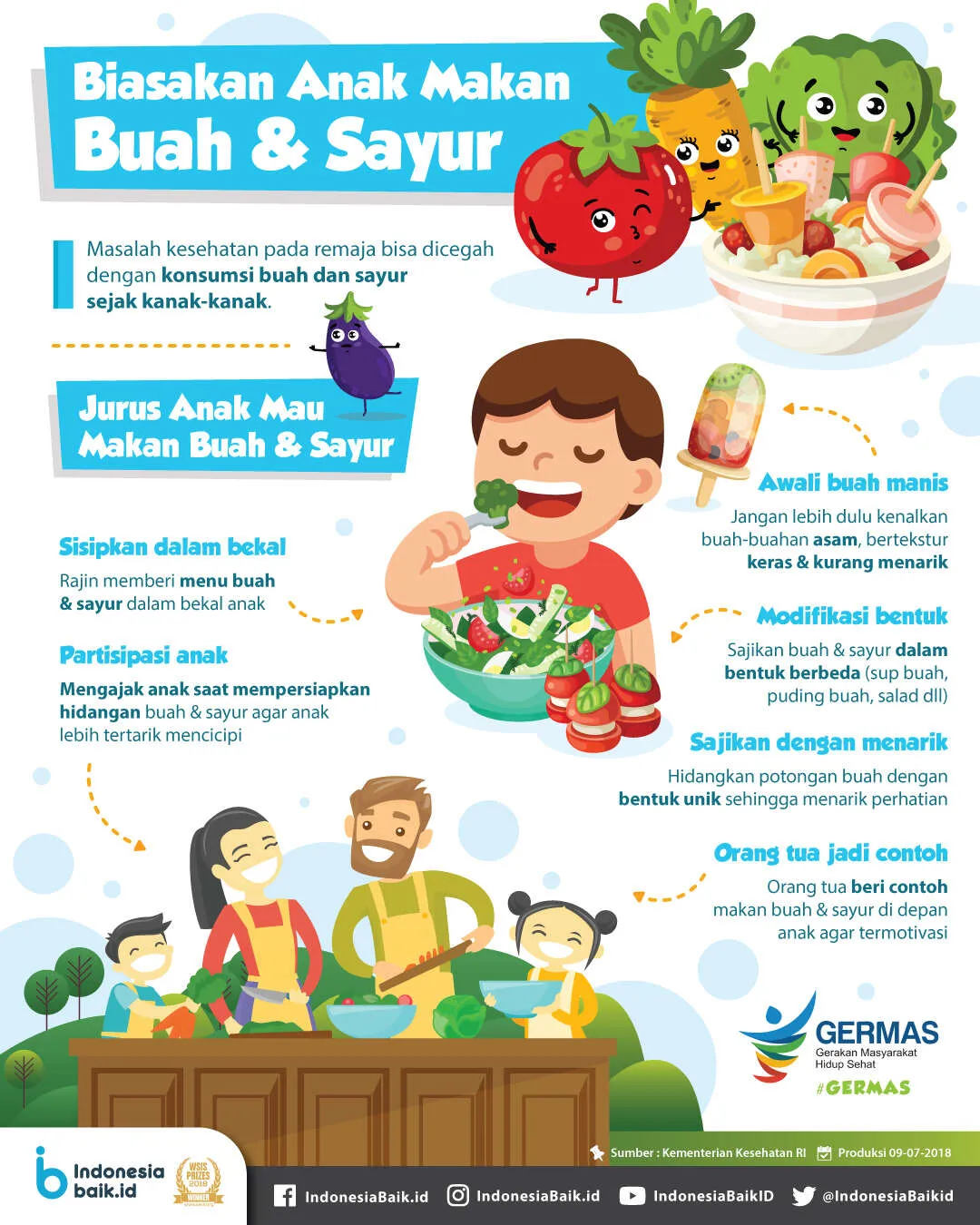 Karena itu Kemenkes mengeluarkan tips atau juru agar anak mau makan buah dan sayur sejak dini. Pertama ialah dengan menyajikan hidangan potongan buah dengan bentuk unik agar menarik perhatian anak. Berikutnya dengan mengenalkan buah manis terlebih dulu. Sejatinya, bila mengenalkan terlebih dulu buah-buahan rasa asam, bertekstur keras, atau kurang menarik pada anak nantinya mereka tidak akan mau memakan buah lagi.