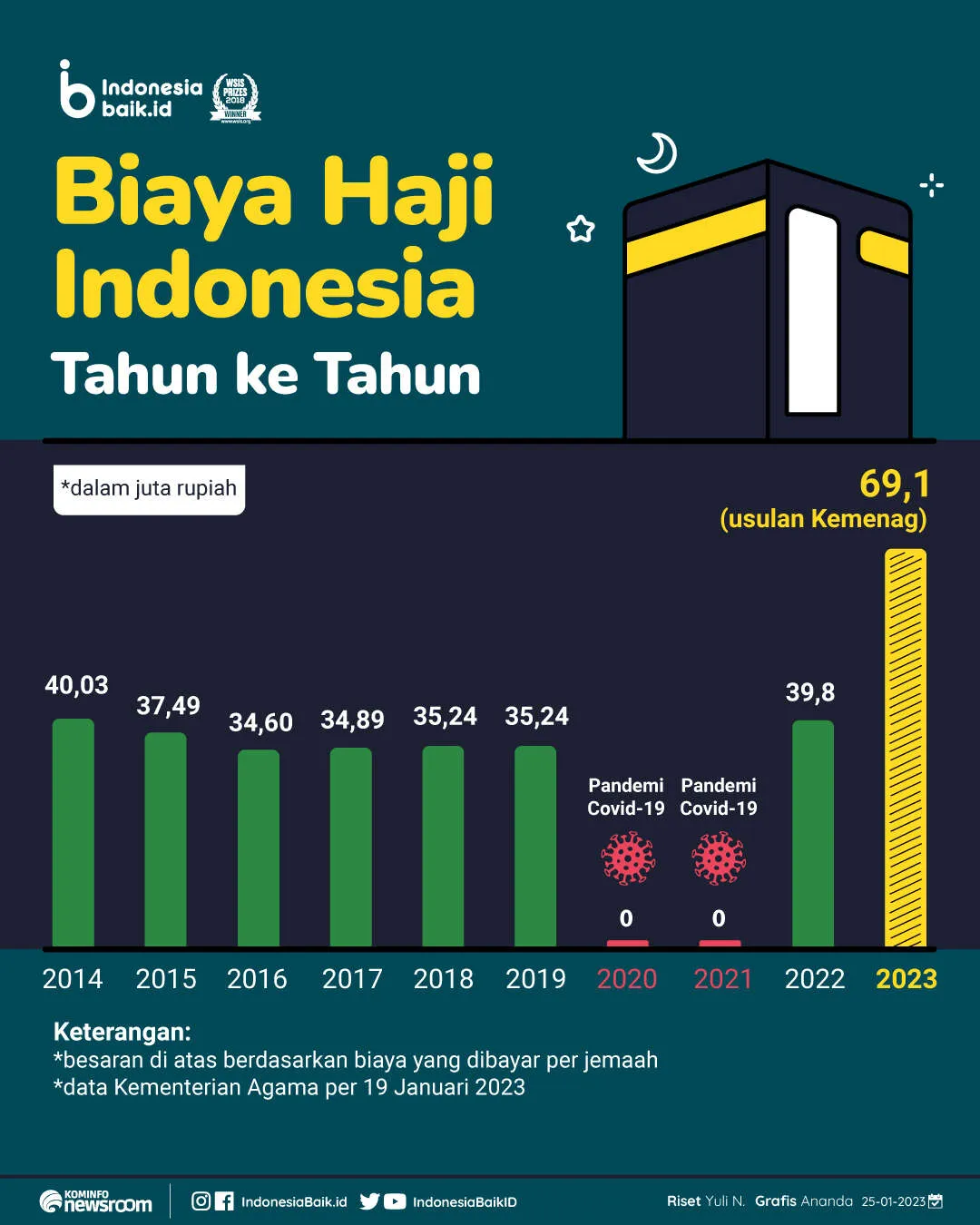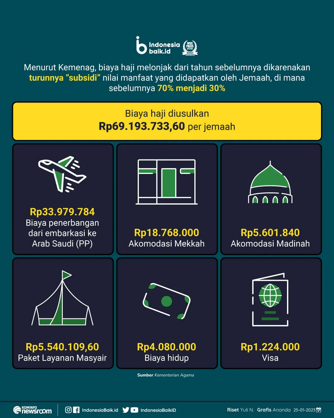 Indonesiabaik.id - Kementerian Agama (Kemenag) mengusulkan biaya perjalanan ibadah haji (Bipih) 2023 mengalami kenaikan sebesar Rp69 juta atau Rp 69.193.733,60 per jemaah. Biaya haji 2023 tersebut merupakan 70 persen dari usulan rata-rata biaya penyelenggaraan ibadah haji (BPIH) yang mencapai Rp98.893.909,11.