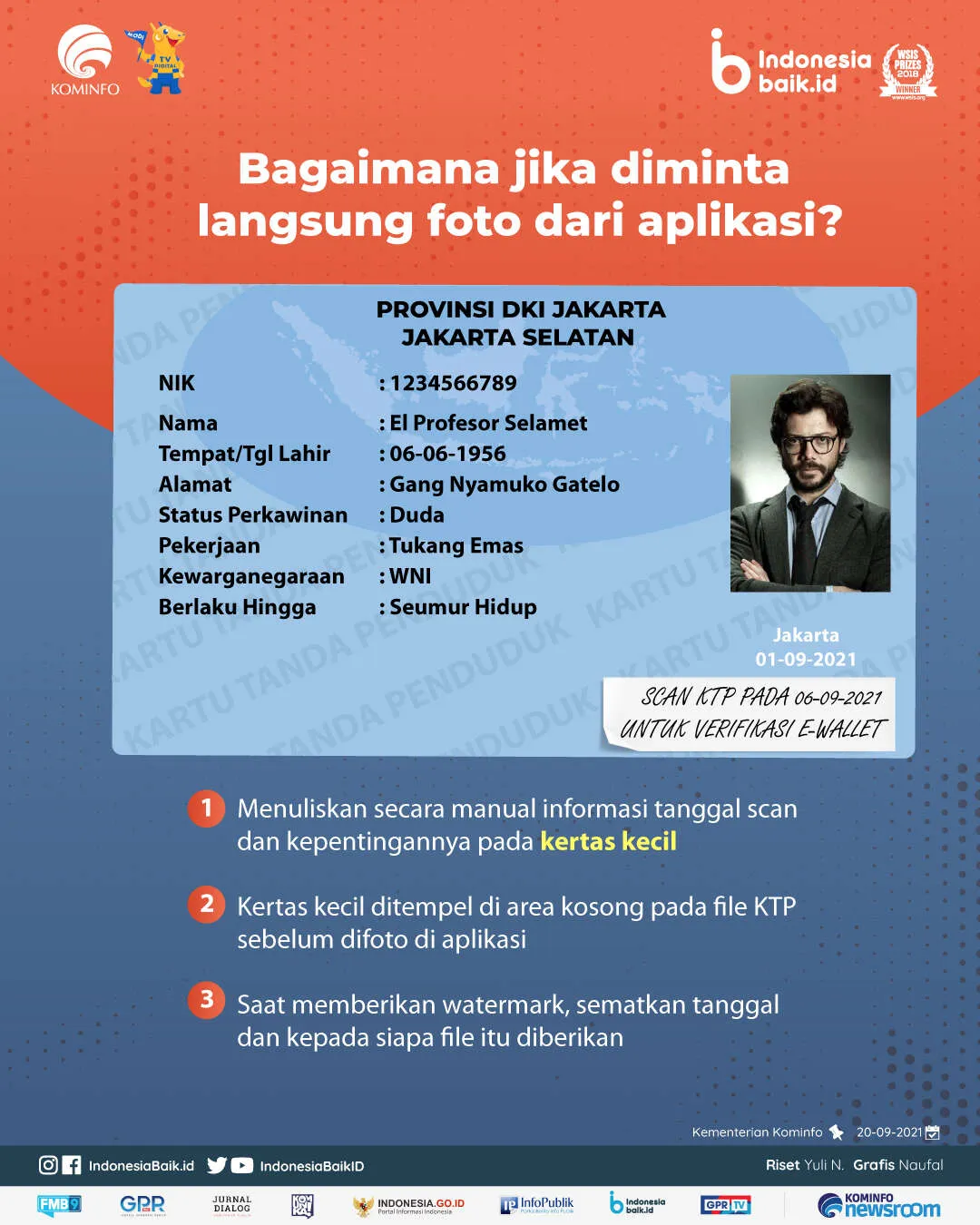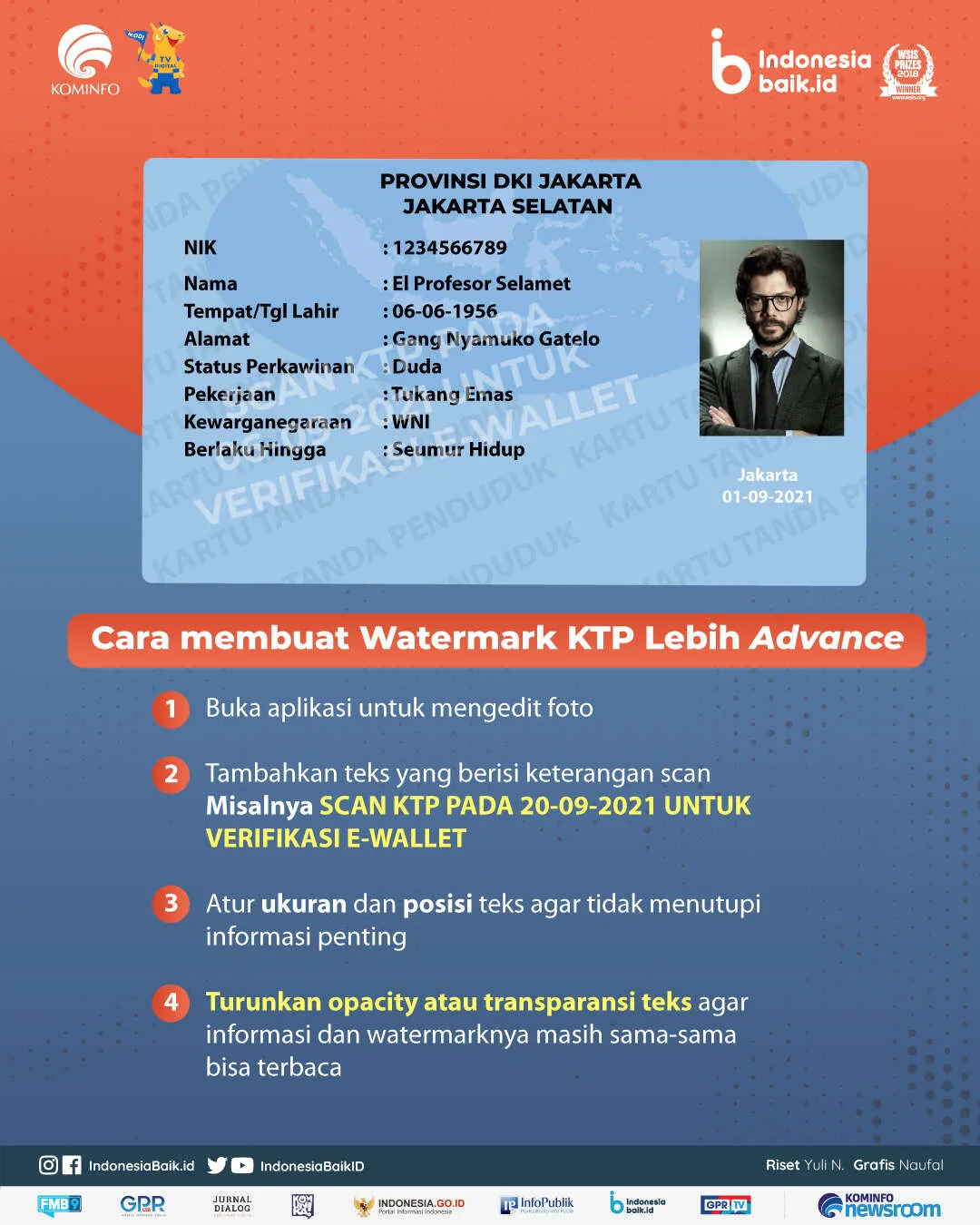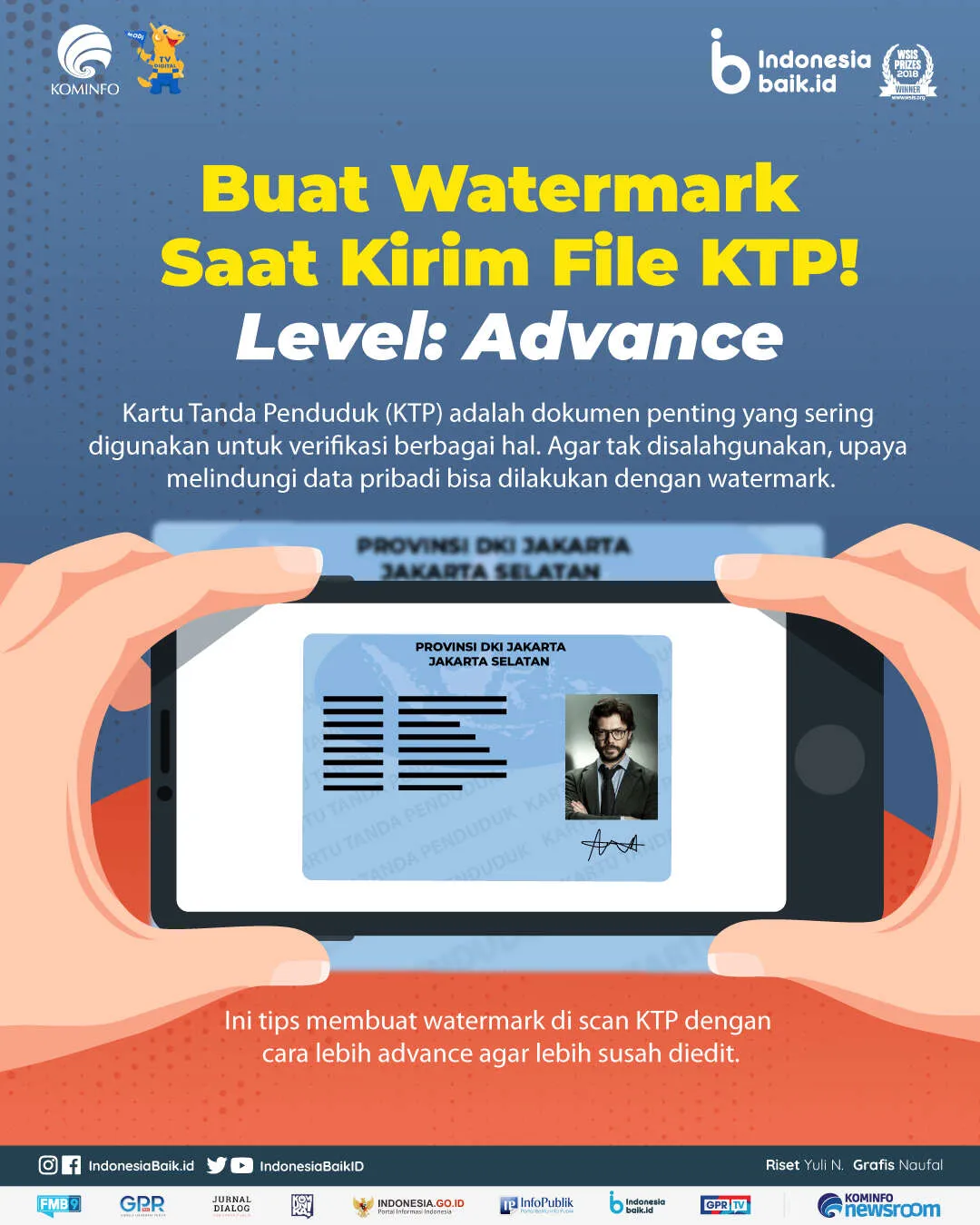 Indonesiabaik.id - Kementerian Komunikasi dan Informatika (Kominfo) menyarankan masyarakat agar memberi watermark saat membagikan data KTP elektronik. Hal itu untuk mencegah terjadinya penyalahgunaan data pribadi warga untuk hal-hal yang negatif.