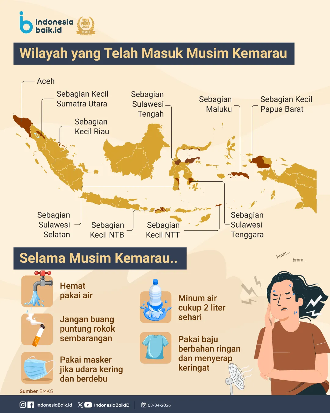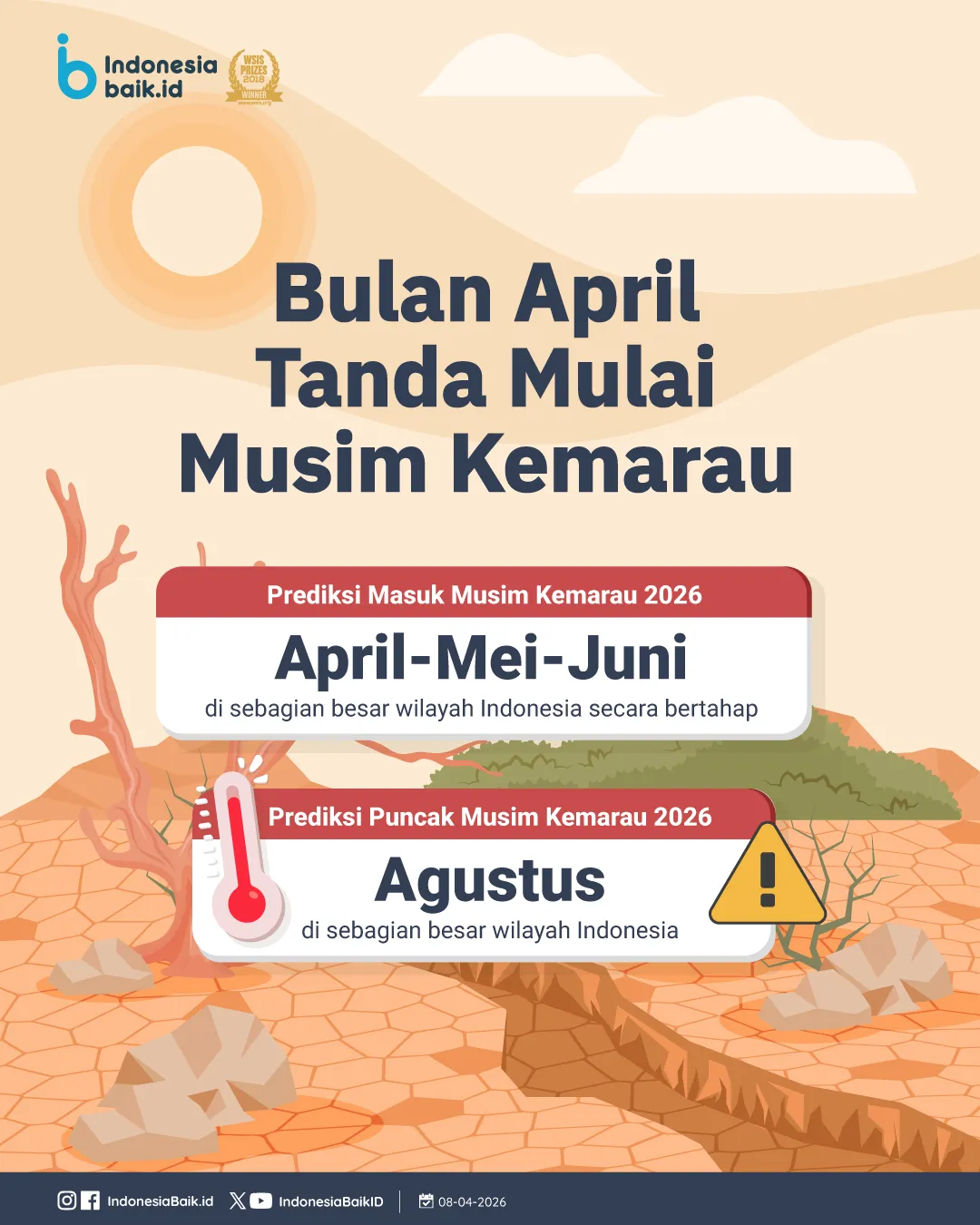 indonesiabaik.id — BMKG mencatat 7% wilayah Indonesia sudah masuk musim kemarau hingga Maret 2026 dan diprediksi meluas hingga Juni, dengan puncak pada Agustus.
