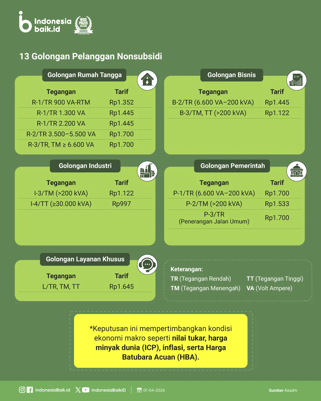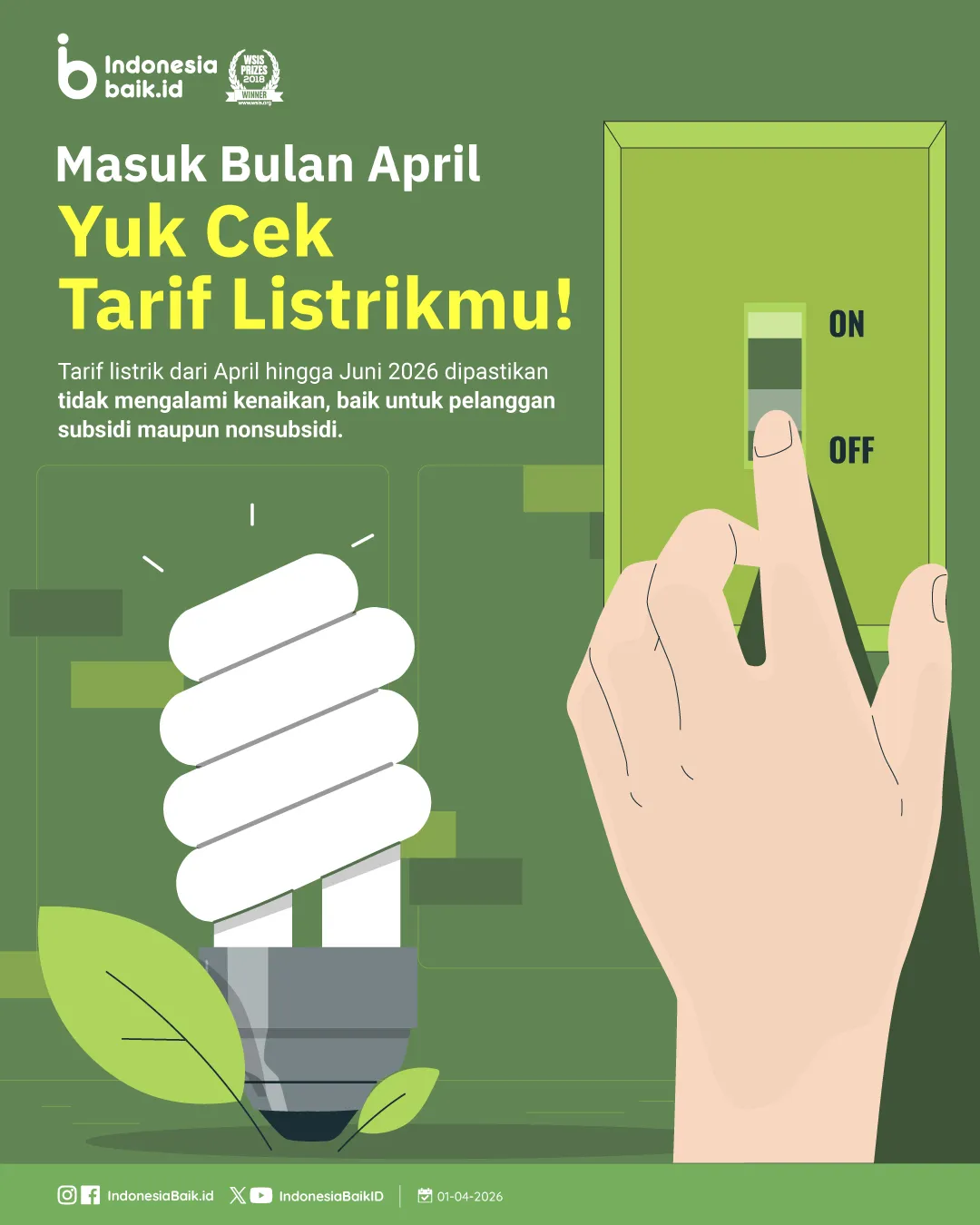 Untuk periode April hingga Juni 2026, tarif listrik dipastikan tidak mengalami kenaikan, baik untuk pelanggan subsidi maupun nonsubsidi.