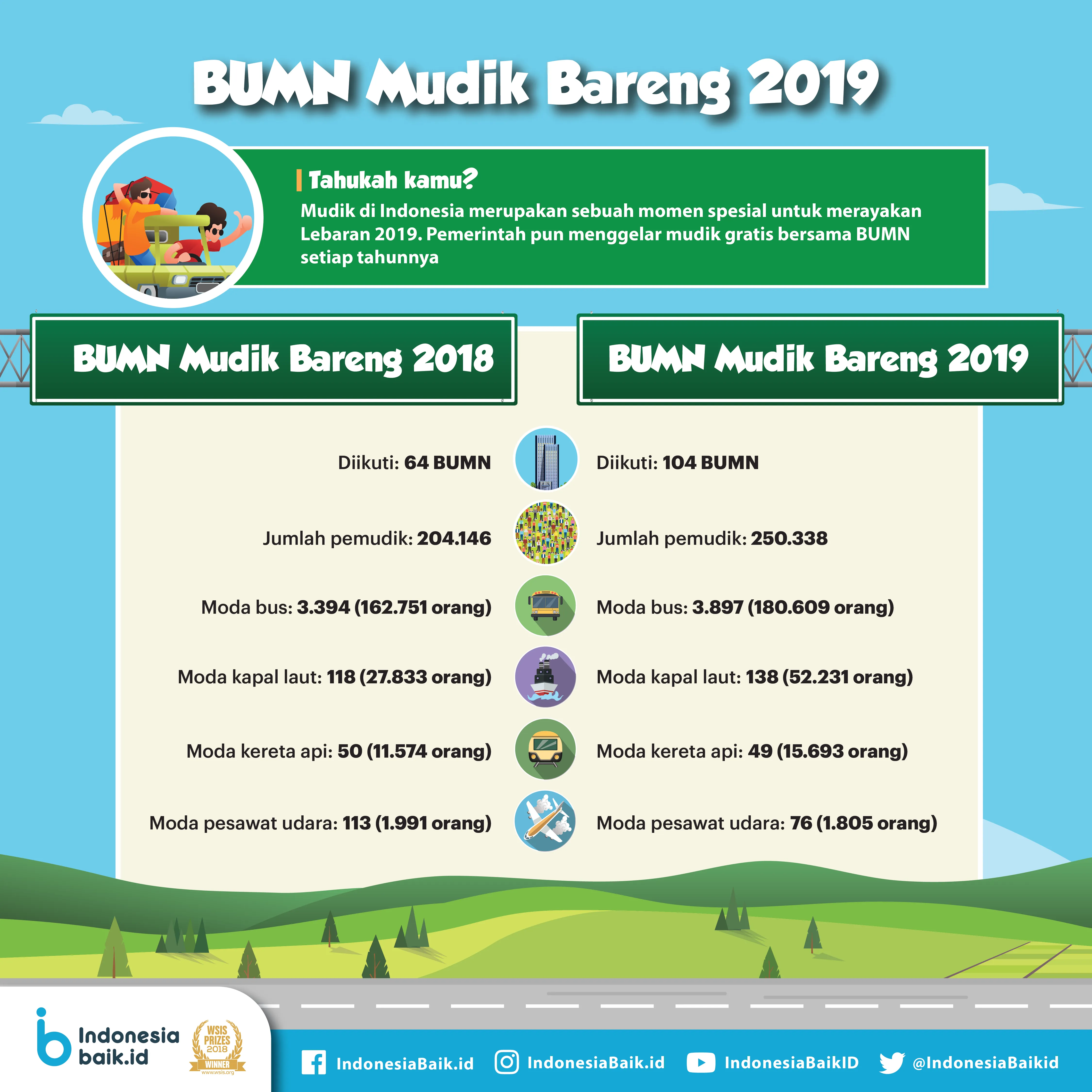 Mudik Bareng BUMN tahun ini diikuti Oleh 104 BUMN dengan target pemudik yang akan diberangkatkan sejumlah 250.338 pemudik atau naik sebesar 22,32% dibandingkan realisasi pemudik pada tahun 2018 sebesar 204.146 pemudik yang diberangkatkan Oleh 64 BUMN.