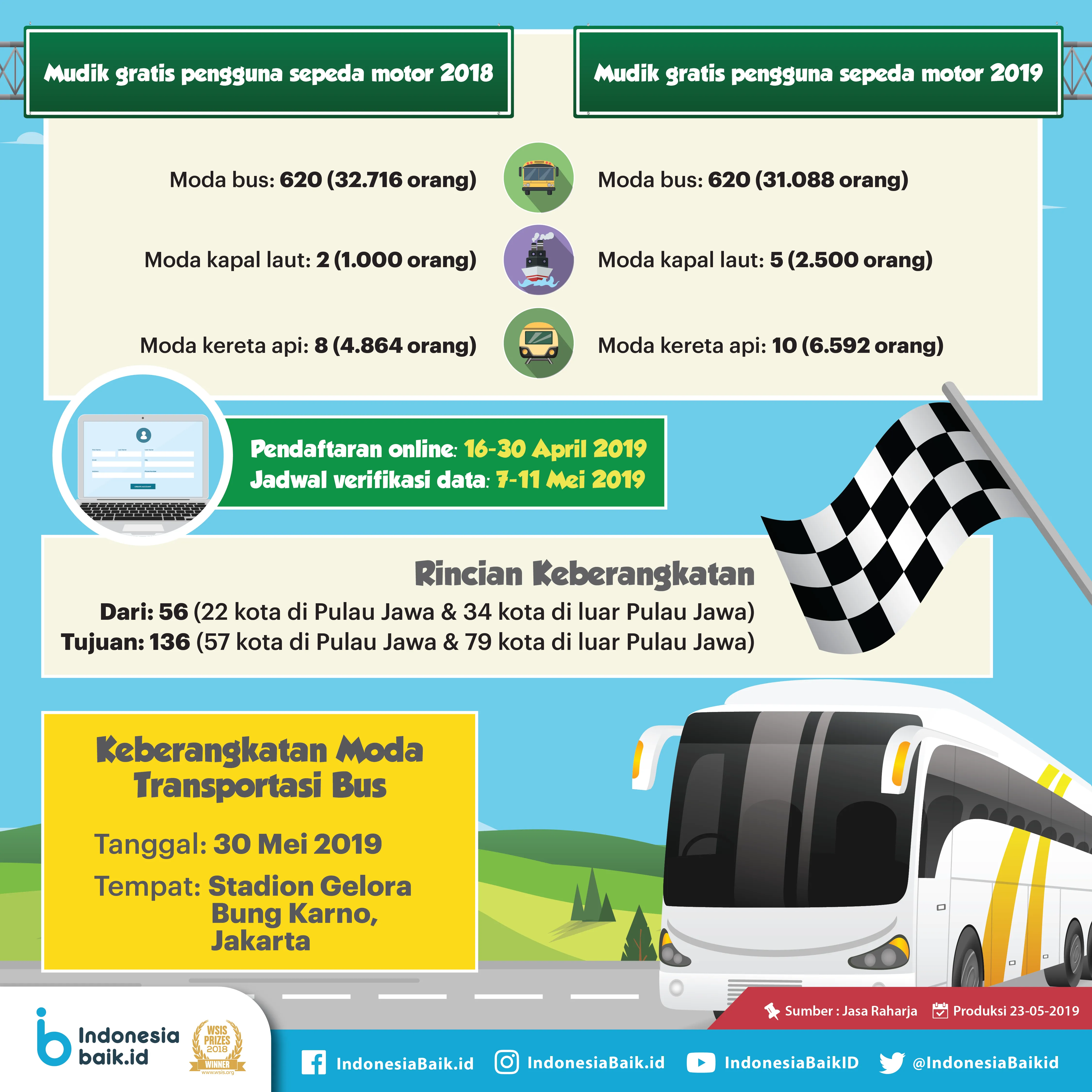 Indonesiabaik.id - PT Jasa Raharja (Persero) mencatatkan jumlah peningkatan pemudik gratis yang pendaftarannya sudah berlangsung pada periode 16-30 April 2019. Untuk verifikasi data BUMN Mudik Bareng 2019 berlangsung 7-11 Mei 2019.