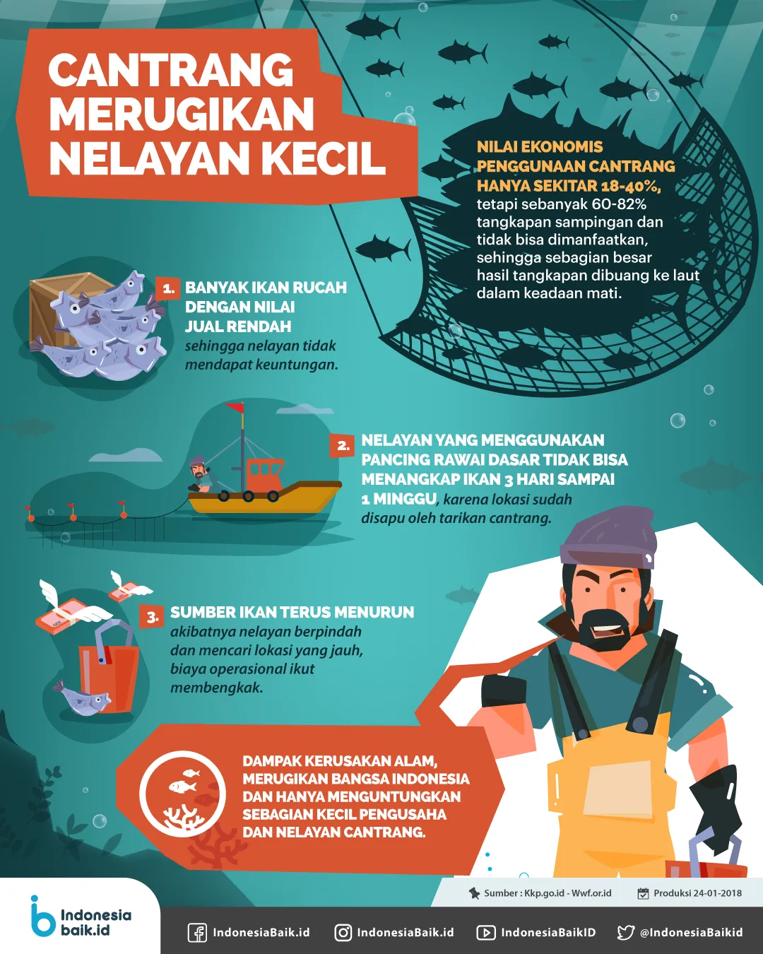 Indonesiabaik.id - Penggunaan cantrang dalam menangkap ikan lebih banyak merugikan dibandingkan keuntungan yang didapat. Meskipun hampir 40% hasil tangkapan cantrang yang bernilai ekonomis dan dapat dikonsumsi, sebanyak 60-82% adalah tangkapan sampingan dan tidak dimanfaatkan, sehingga sebagian besar hasil tangkapan tersebut dibuang ke laut dalam keadaan mati.