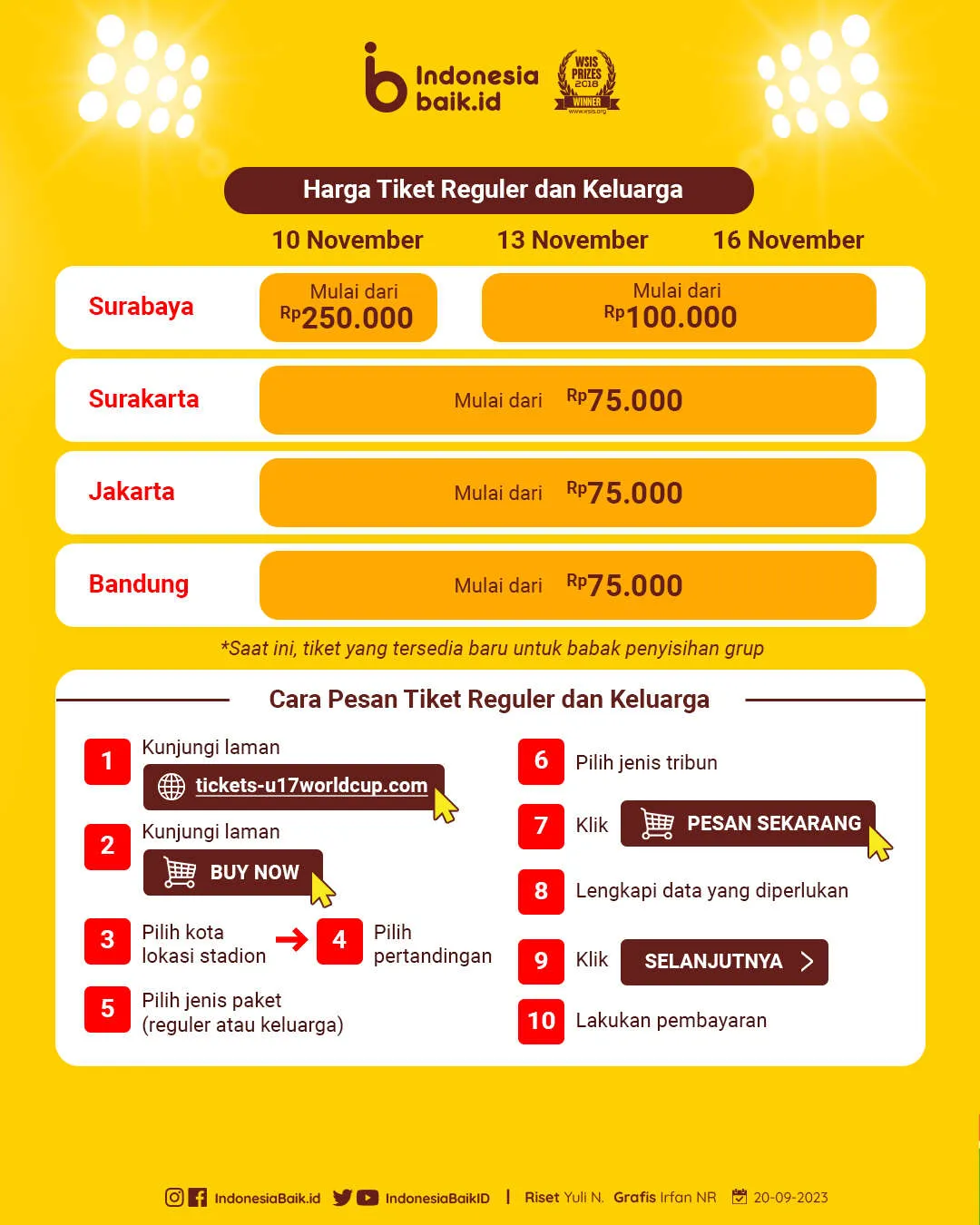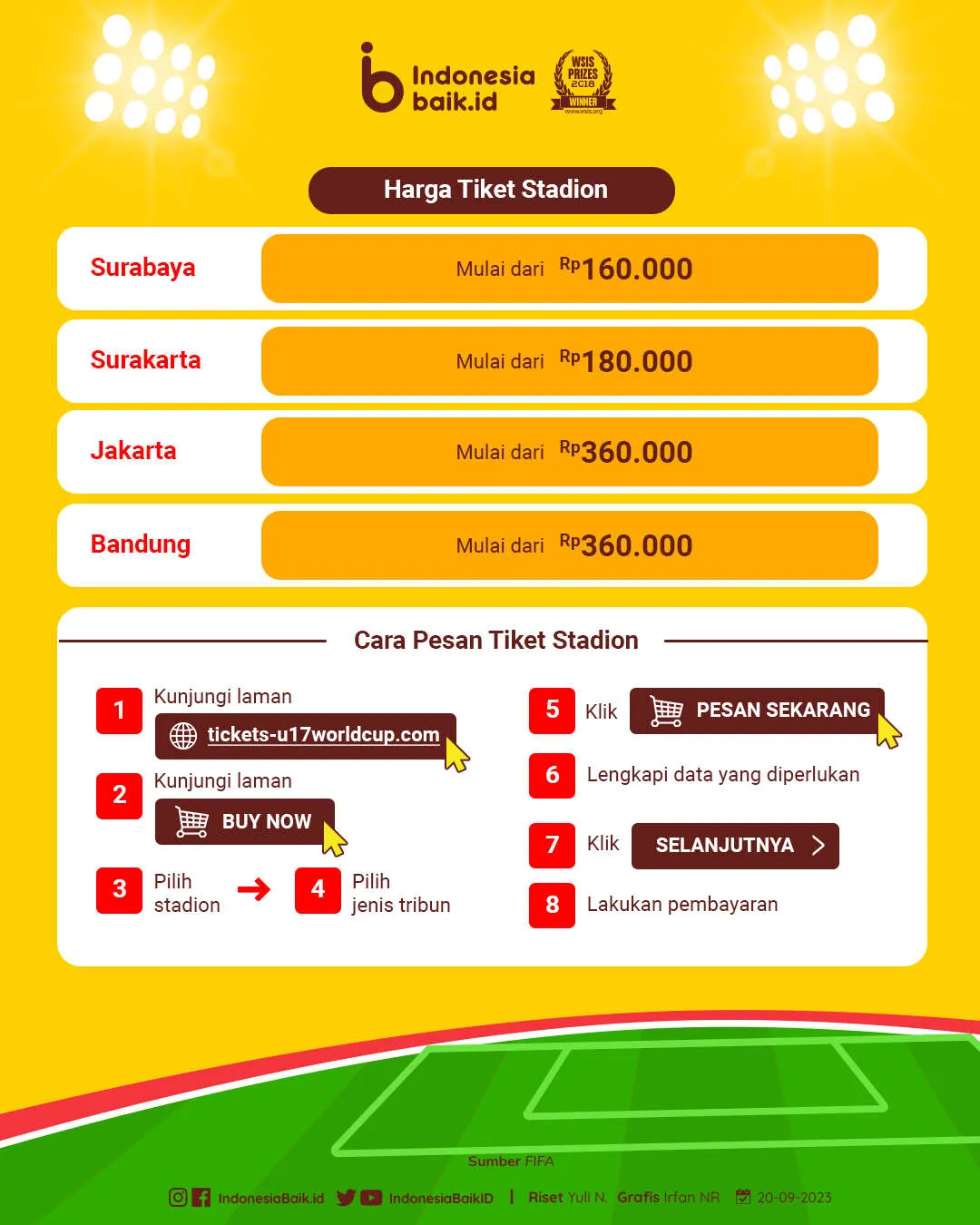Indonesiabaik.id - Federasi Sepak Bola Internasional (FIFA) resmi mengumumkan harga tiket menonton Piala Dunia U-17 2023 yang bakal diselenggarakan di Indonesia. FIFA telah membuka pendaftaran secara daring untuk pembelian tiket Piala Dunia U-17 2023 melalui laman resmi FIFA.