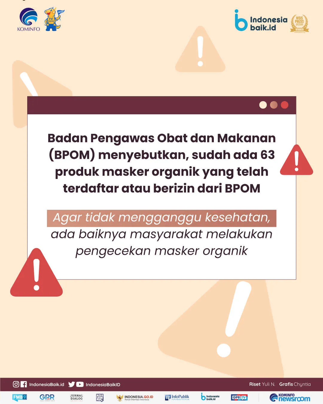 Indonesiabaik.id - Badan Pengawas Obat dan Makanan (BPOM) menyebutkan, sudah ada 63 produk masker organik yang telah terdaftar atau berizin dari BPOM. Tujuannya, daftar masker organik yang terdaftar di BPOM ini agar masyarakat bisa lebih mewaspadai produk yang tidak berizin BPOM yang dapat mengganggu kesehatan.
