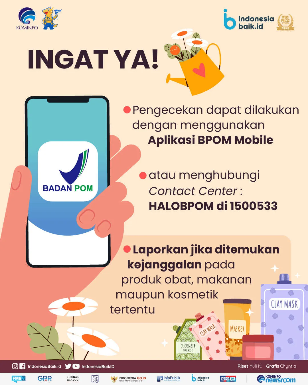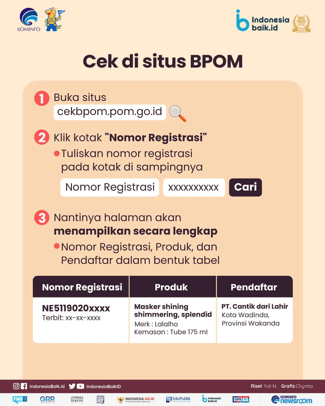 - Cek Izin edar Badan POM, setiap produk obat dan makanan termasuk kosmetika yang beredar di Indonesia harus melalui pengawasan Badan POM terlebih dahulu dan memeroleh izin edar