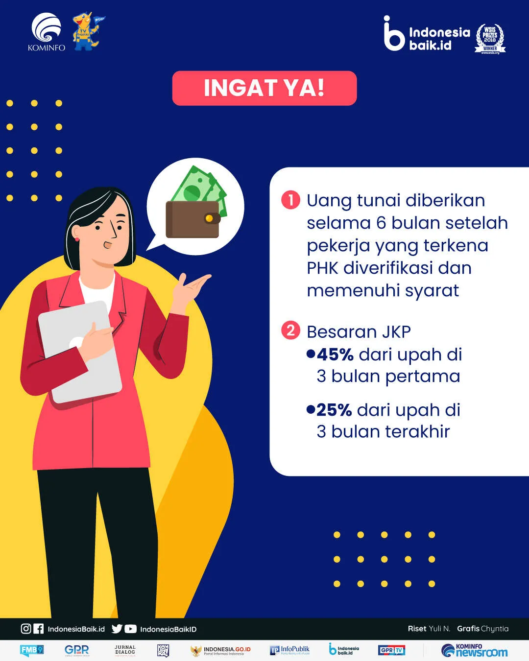 Seperti diketahui, manfaat uang tunai dari JKP diberikan selama 6 bulan setelah pekerja yang terkena PHK diverifikasi oleh BPJS Ketenagakerjaan dan memenuhi syarat sebagai penerima. Besaran JKP dihitung dengan formulasi 45 persen × upah × 3 bulan pertama dan 25 persen × upah × 3 bulan terakhir.
