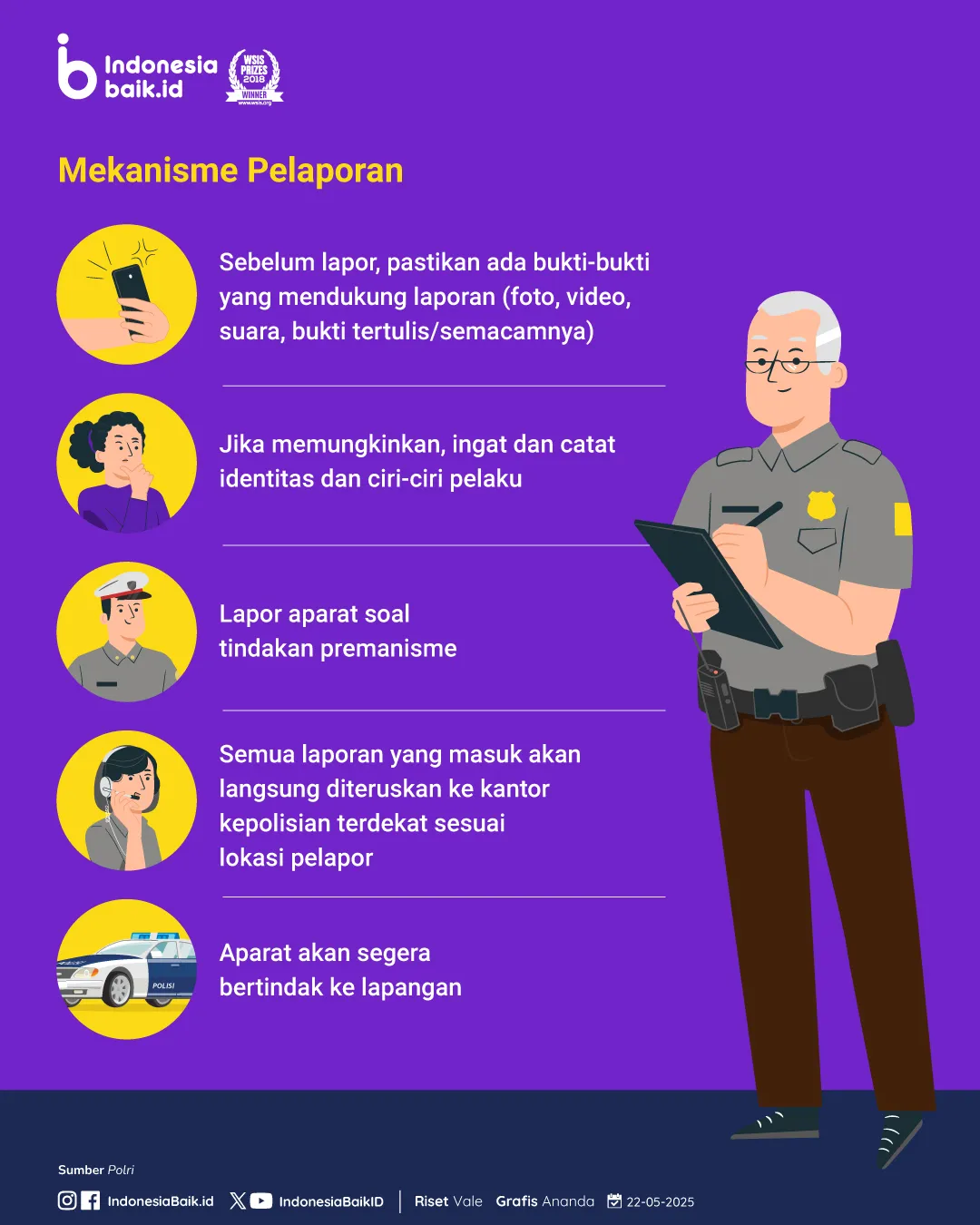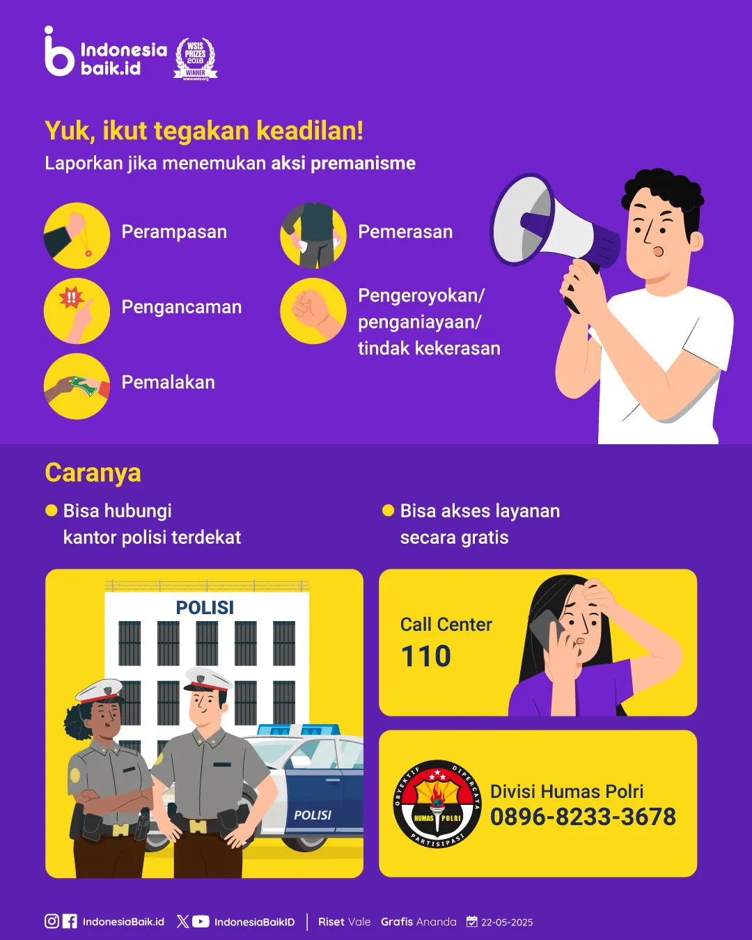Setiap warga negara berhak merasa aman dan dilindungi oleh hukum di negara kita sendiri kan? Karena itu, jangan ragu untuk melaporkan jika melihat atau mengalami tindakan premanisme ya!