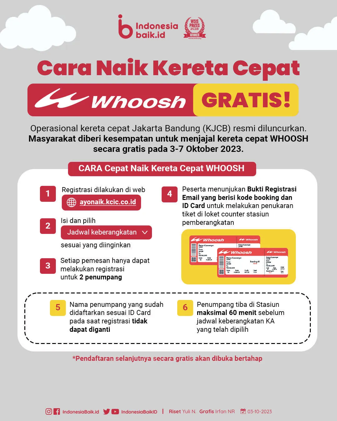 Indonesiabaik.id - Masyarakat bisa menjajal kereta cepat Jakarta-Bandung (KCJB) atau KA Cepat Whoosh secara gratis hingga pertengahan Oktober 2023. Meski gratis, kuota yang disediakan terbatas.