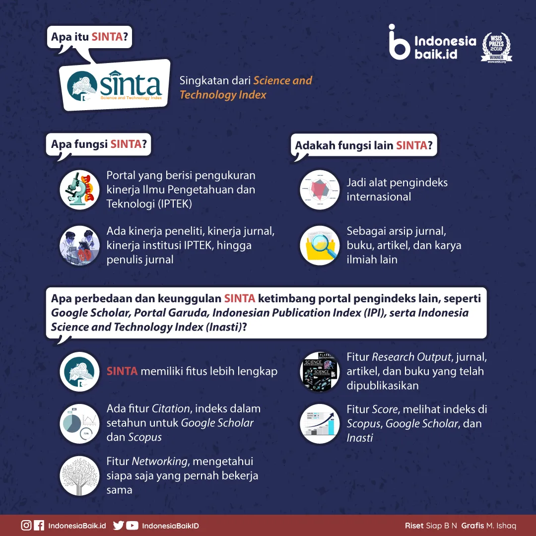 Aplikasi ini berupa portal yang berisi pengukuran kinerja Ilmu Pengetahuan dan Teknologi (IPTEK) antara lain kinerja peneliti, kinerja jurnal, kinerja institusi IPTEK, dan author atau penulis jurnal. Selain mengukur kinerja IPTEK, SINTA juga menjadi alat pengindeks internasional sebagai arsip jurnal, buku, artikel, dan karya ilmiah lainnya.
