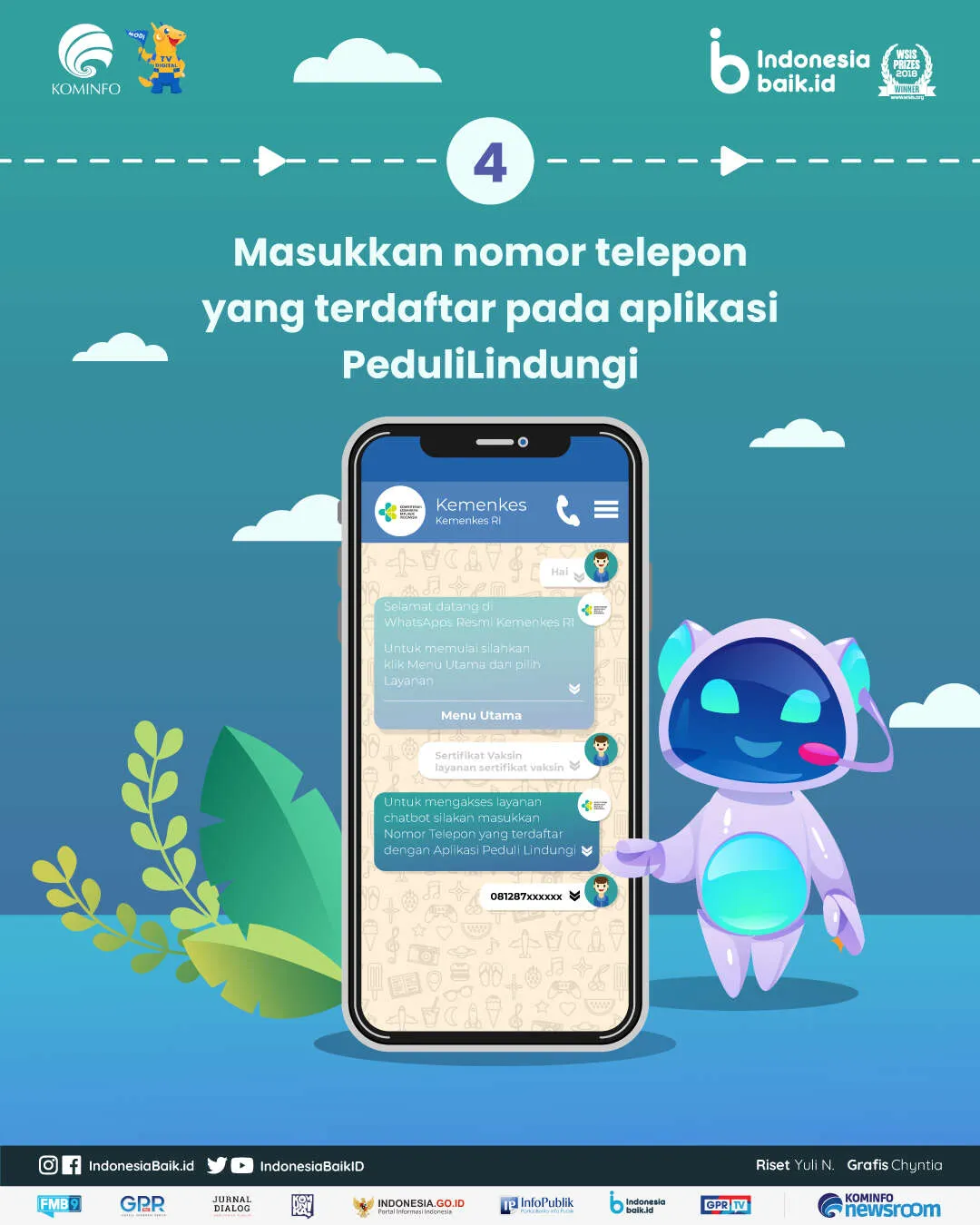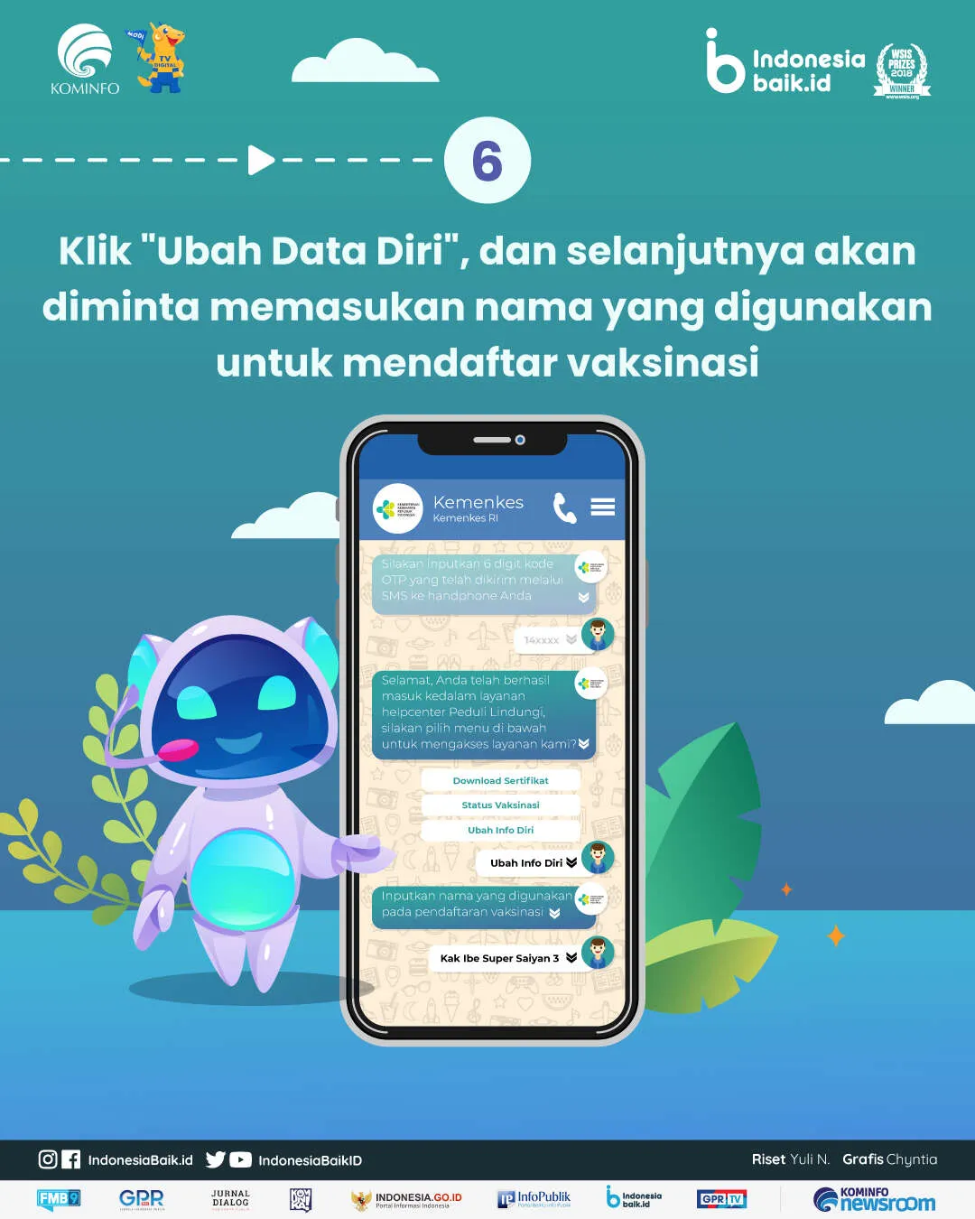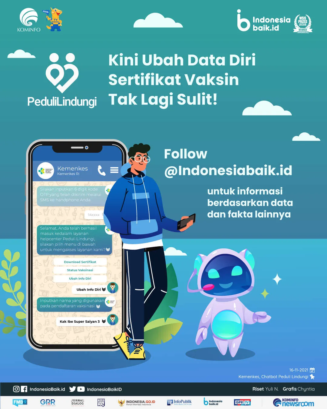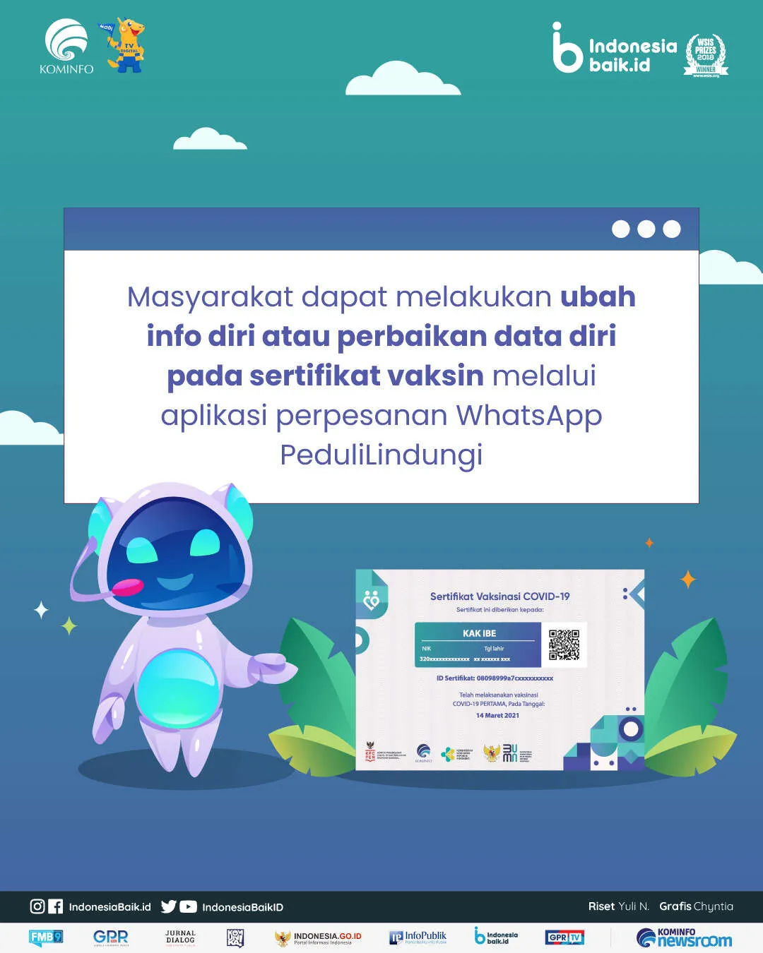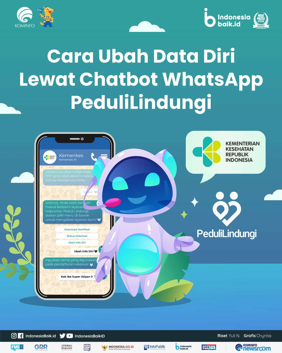 indonesiabaik.id - Kini, masyarakat dapat melakukan ubah info diri atau perbaikan data diri pada sertifikat vaksin melalui aplikasi perpesanan WhatsApp. Pengubahan info diri, download sertifikat vaksin, maupun melihat status vaksinasi dapat dilakukan melalui Chatbot WhatsApp PeduliLindungi.
