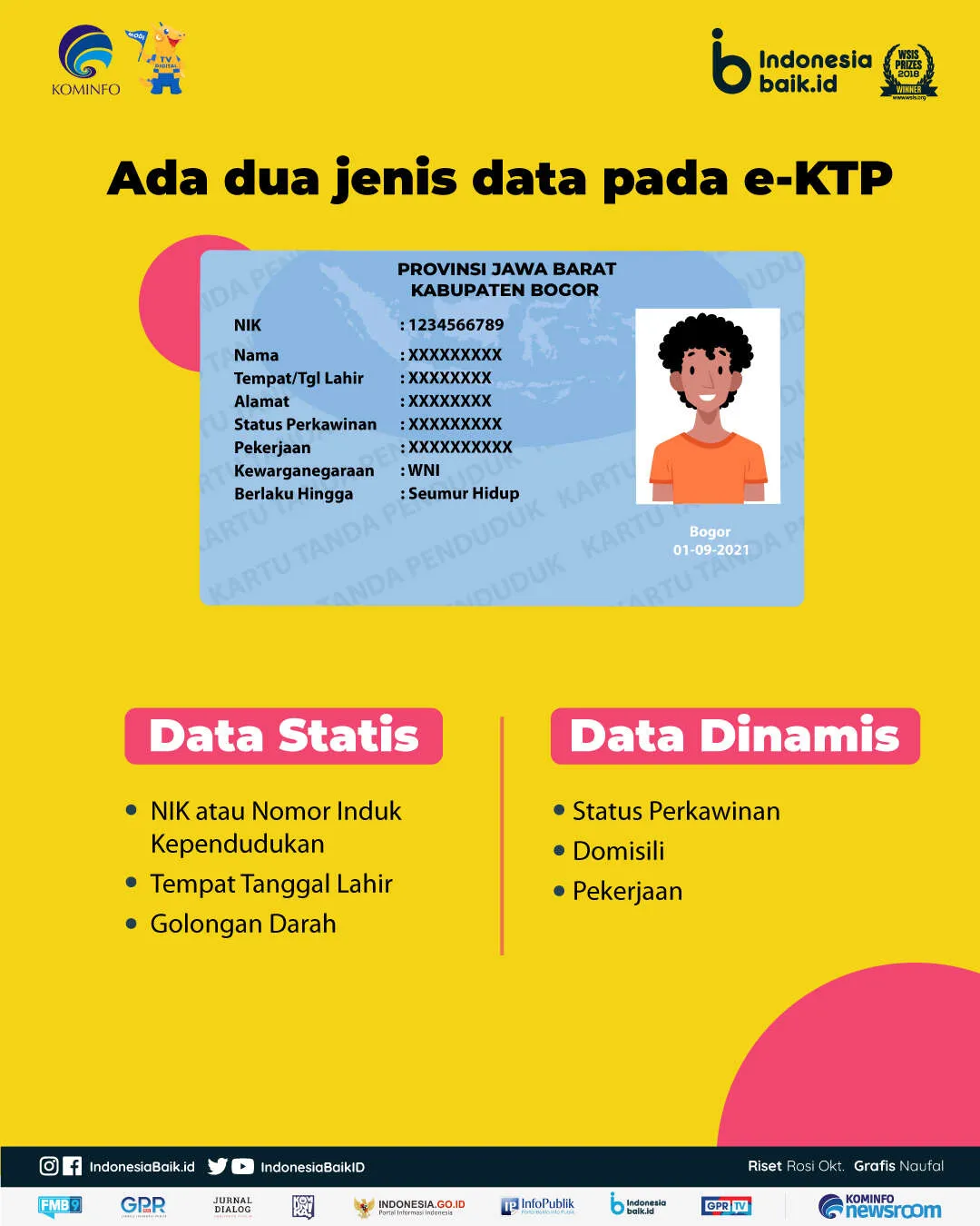 Dalam data e-KTP, ada beberapa data yang bersifat statis (tak berubah), seperti Nomor Induk Kependudukan dan tempat tanggal lahir. Namun, ada juga yang bersifat dinamis (bisa berubah), seperti status kawin dan domisili.