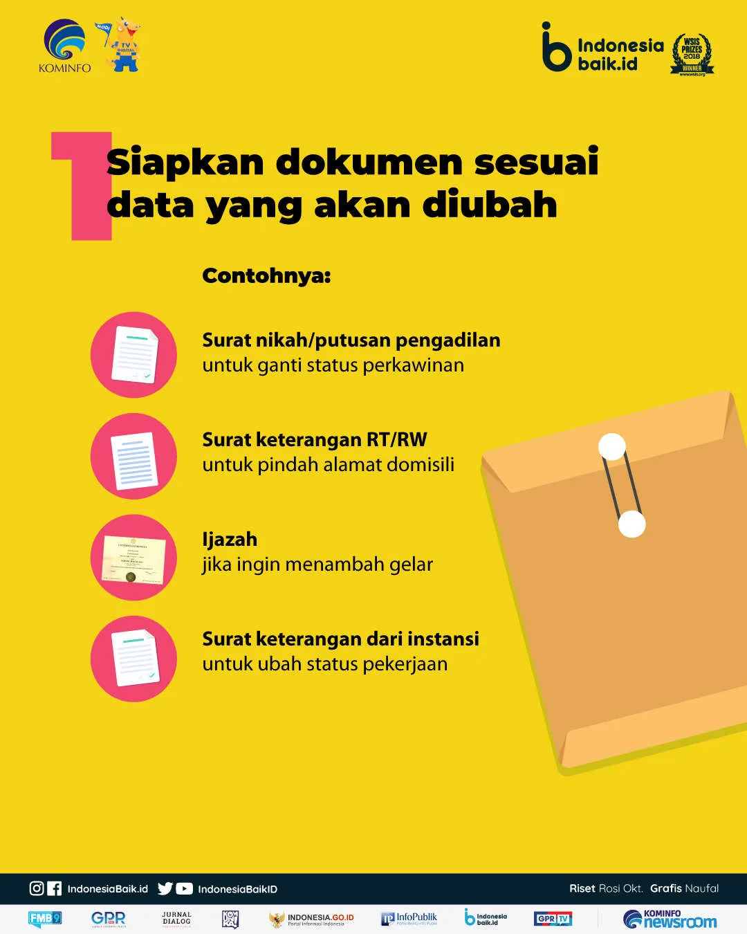 - Membawa dokumen yang diperlukan sesuai data atau identitas diri yang akan diubah, misalnya surat nikah atau putusan pengadilan untuk mengganti status perkawinan, surat keterangan RT/RW untuk pindah alamat domisili, surat keterangan dari instansi untuk merubah status pekerjaan.