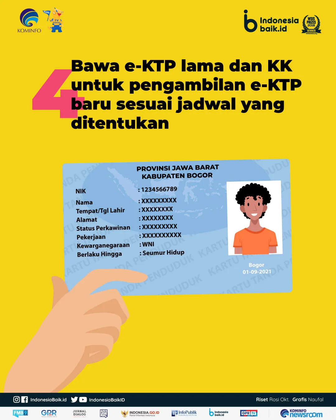 - Bawa e-KTP lama dan KK untuk pengambilan e-KTP baru sesuai jadwal yang telah ditentukan