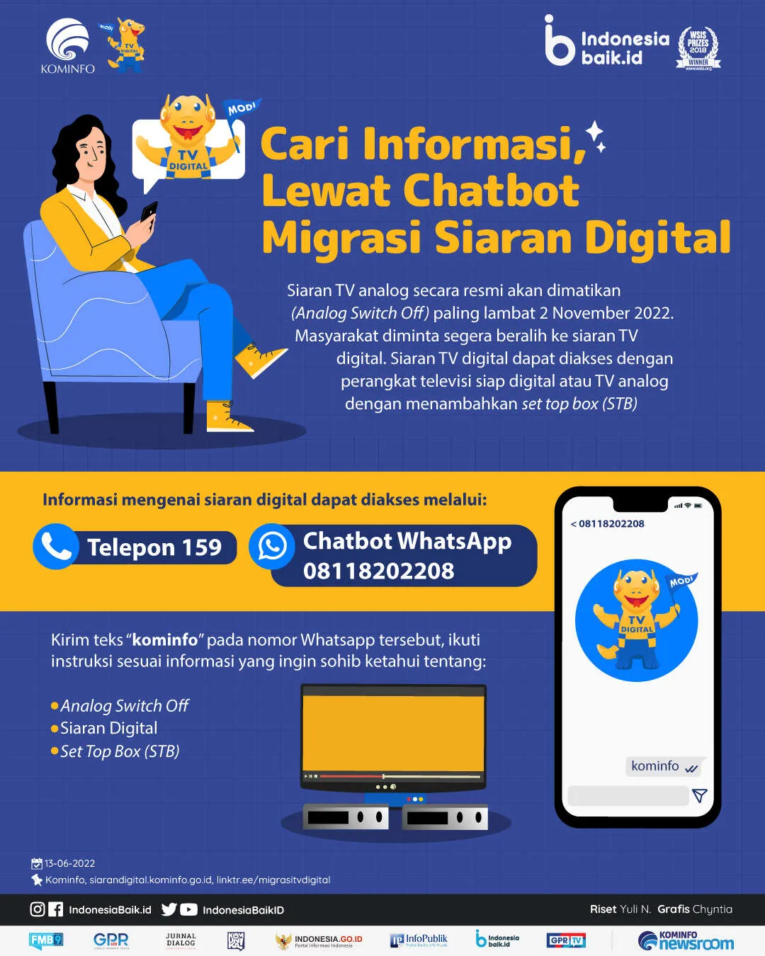 Kementerian Komunikasi dan Informatika (Kemenkominfo) mengenalkan layanan chatbot WhatsApp Migrasi Siaran Digital. Layanan Kemenkominfo itu bertujuan untuk memudahkan masyarakat dalam mencari informasi mengenai program migrasi siaran TV analog ke TV digital, atau yang dikenal dengan Analog Switch Off (ASO).