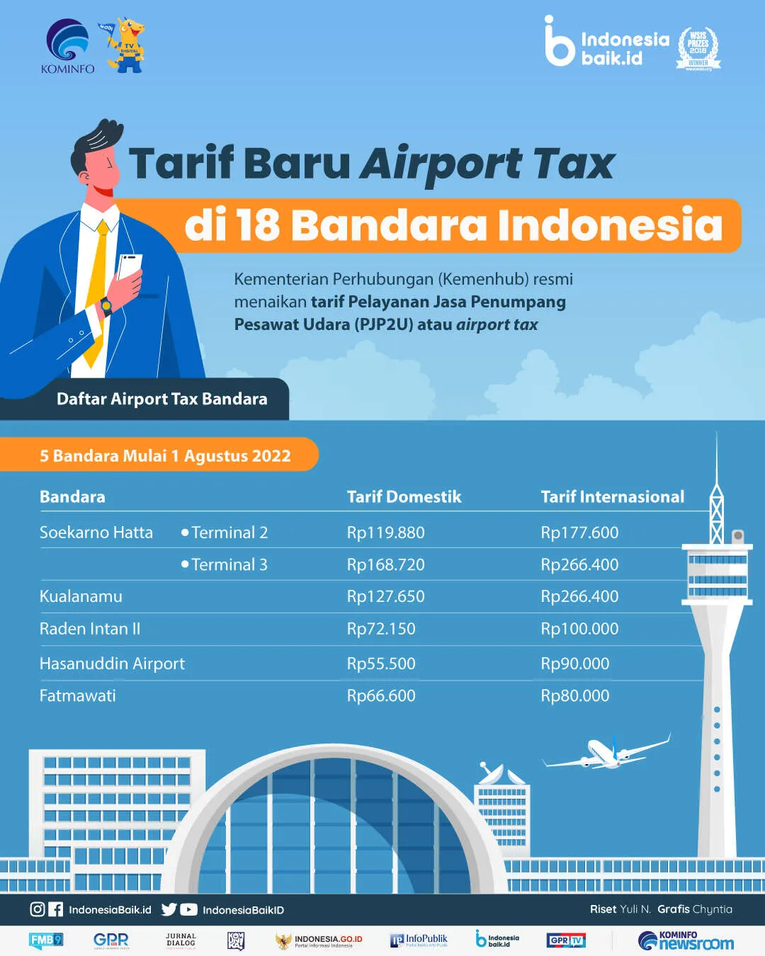 Indonesiabaik.id - Tarif Airport Tax atau Pelayanan Jasa Penumpang Pesawat Udara (PJP2U) mengalami kenaikan. Tarif Airport Tax naik di sejumlah bandara di Indonesia. Hal ini dikarenakan Kemenhub memahami beban biaya operasi pada bandara yang diselenggarakan oleh operator guna memastikan keselamatan, keamanan dan pelayanan bandar udara sesuai peraturan perundang-undangan.